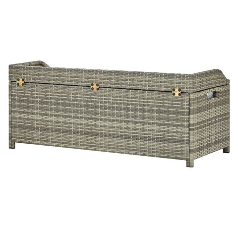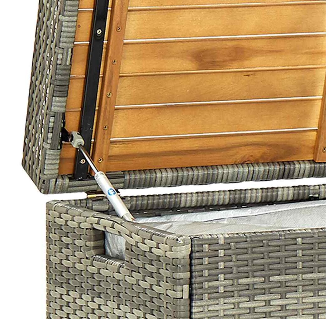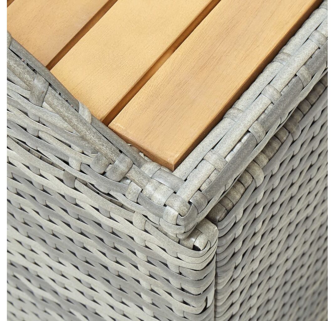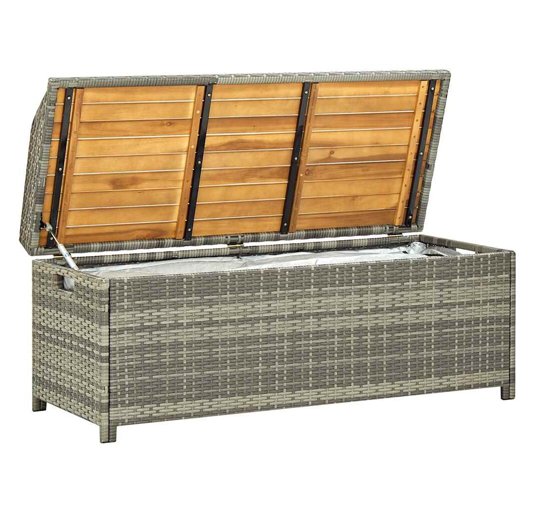Concepută cu un spațiu generos de depozitare, banca este suficient de mare pentru a depozita obiecte de grădină precum: perne de mobilier, perne decorative, pături suplimentare, jucării pentru piscină și unelte de grădinărit. Această bancă de grădină este construită din poliratan, șipci din lemn masiv de acacia și un cadru din oțel, fiind durabilă, rezistentă la intemperii pentru utilizare îndelungată. Are o căptușeală care va proteja conținutul de praf și umiditate. Datorită picioarelor ridicate, această bancă de exterior asigură o bună circulație a aerului dedesubt și menține conținutul uscat și curat. Se șterge ușor cu o cârpă umedă.