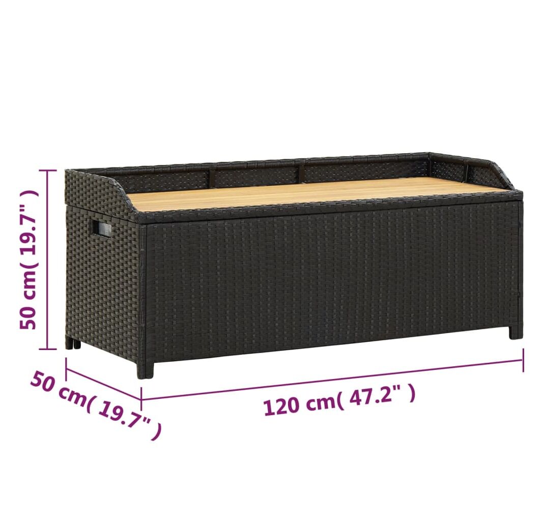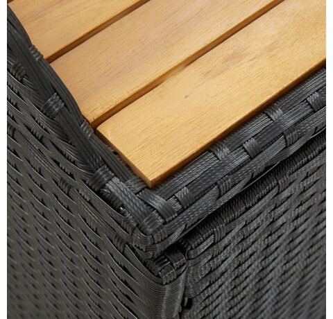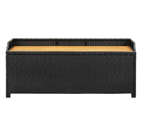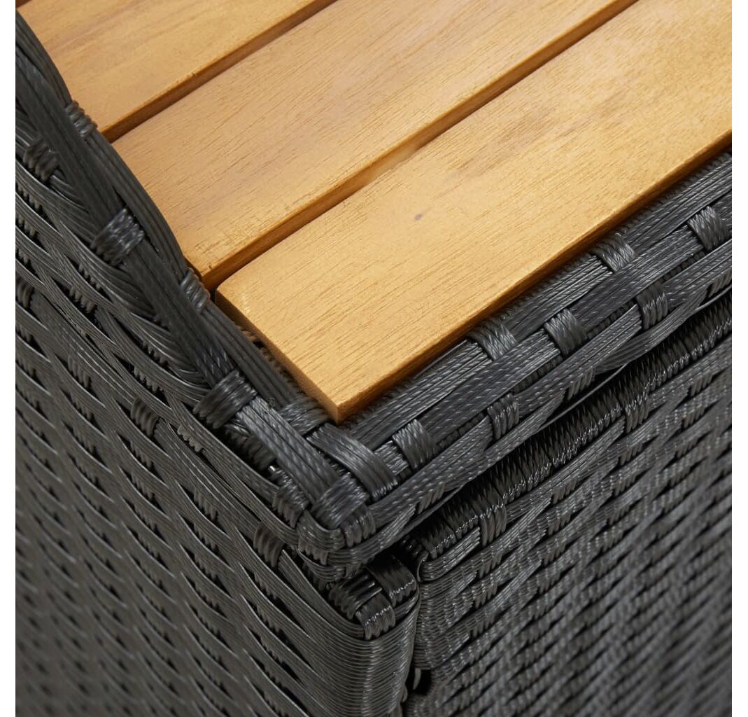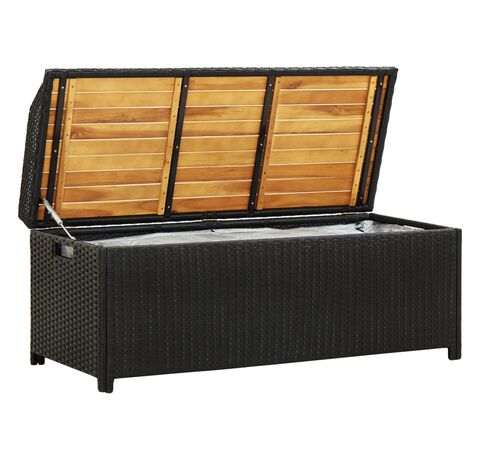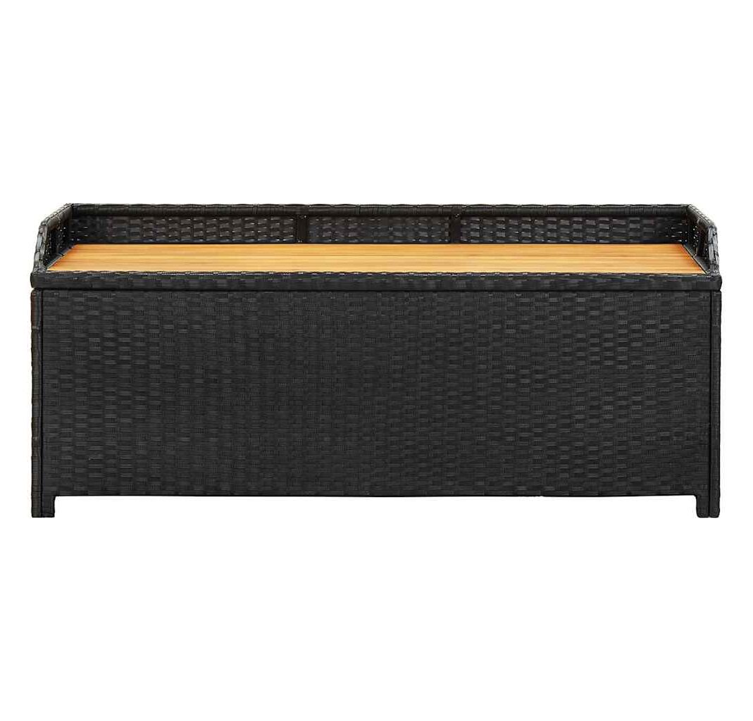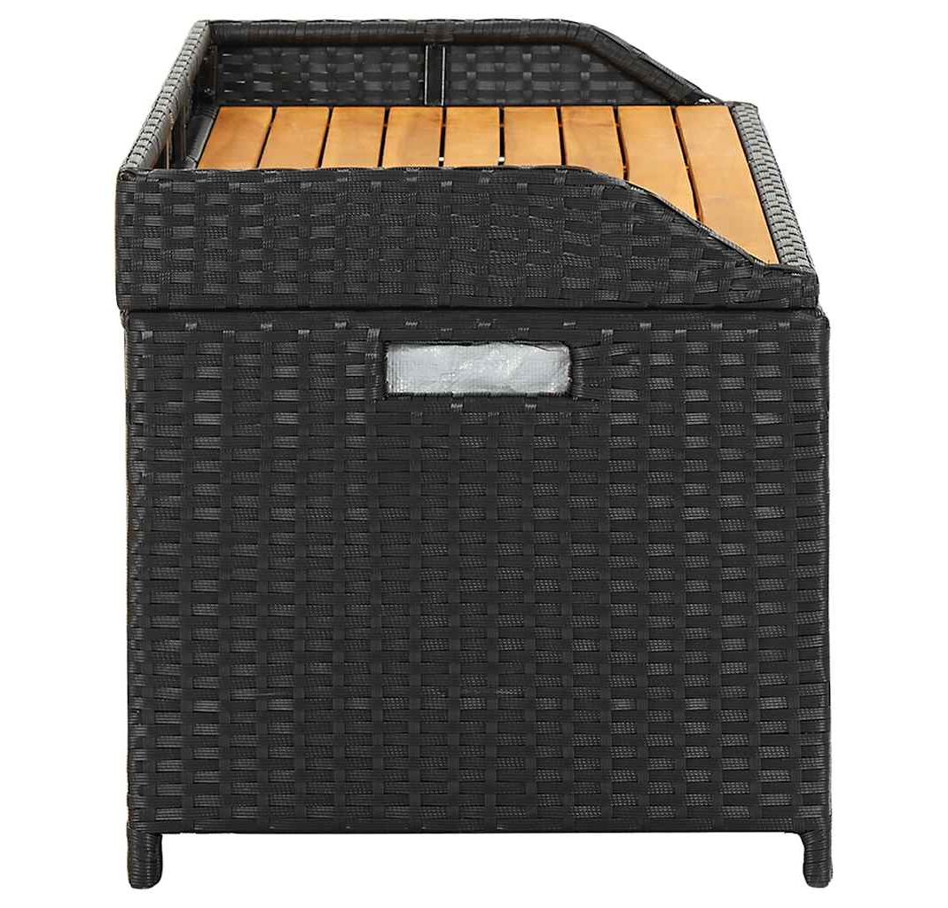 Concepută cu un spațiu generos de depozitare, banca este suficient de mare pentru a depozita obiecte de grădină precum: perne de mobilier, perne decorative, pături suplimentare, jucării pentru piscină și unelte de grădinărit. Această bancă de grădină este construită din poliratan, șipci din lemn masiv de acacia și un cadru din oțel, fiind durabilă, rezistentă la intemperii pentru utilizare îndelungată. Are o căptușeală care va proteja conținutul de praf și umiditate. Datorită picioarelor ridicate, această bancă de exterior asigură o bună circulație a aerului dedesubt și menține conținutul uscat și curat. Se șterge ușor cu o cârpă umedă.