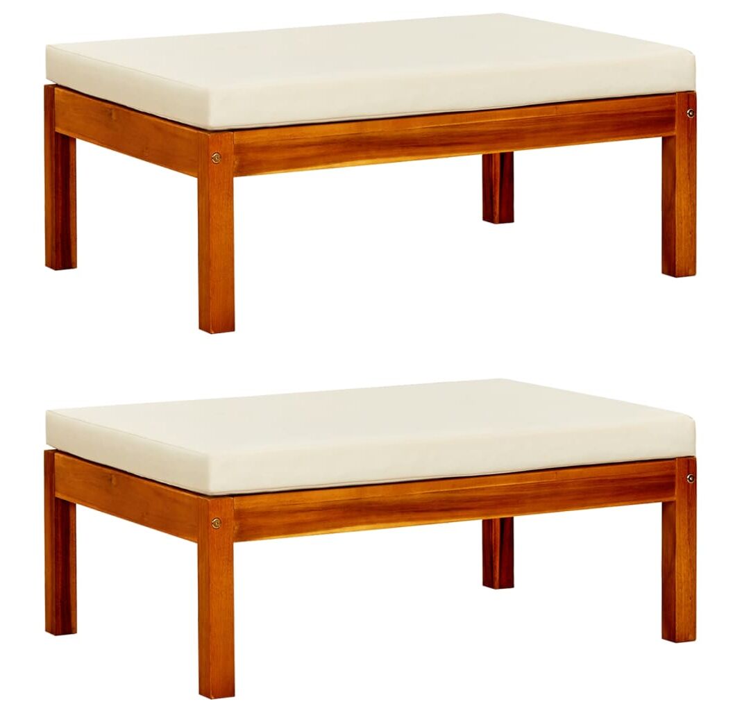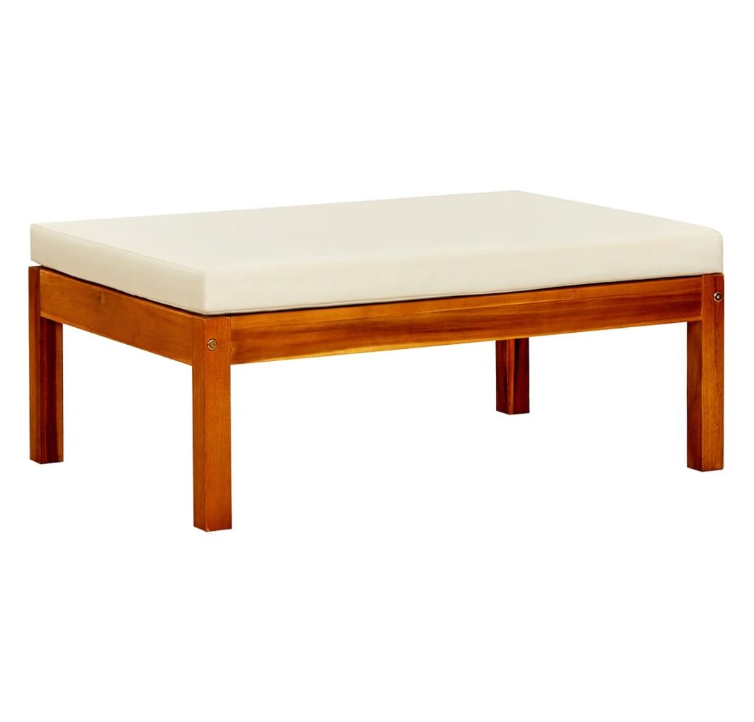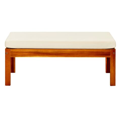 Această bancă din lemn cu suporturi pentru picioare și perne combină stilul și funcționalitatea și adaugă o notă de farmec rustic spațiului dvs. de locuit în aer liber.