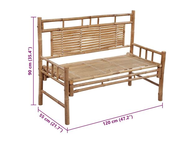 Banca de exterior este proiectată cu spătar, fiind confortabilă pentru lectură sau odihnă. Realizată din bambus rezistent la intemperii și impermeabil, banca de grădină este durabilă și stabilă. De asemenea, este ușor de curățat cu o cârpă umedă. Mai mult, perna inclusă oferă un plus de confort în timpul relaxării. Este fabricată din poliester 100%, care a fost tratat pentru a fi impermeabil. Fiecare pernă are două seturi de sfori, pentru o fixare mai bună pe bancă.
