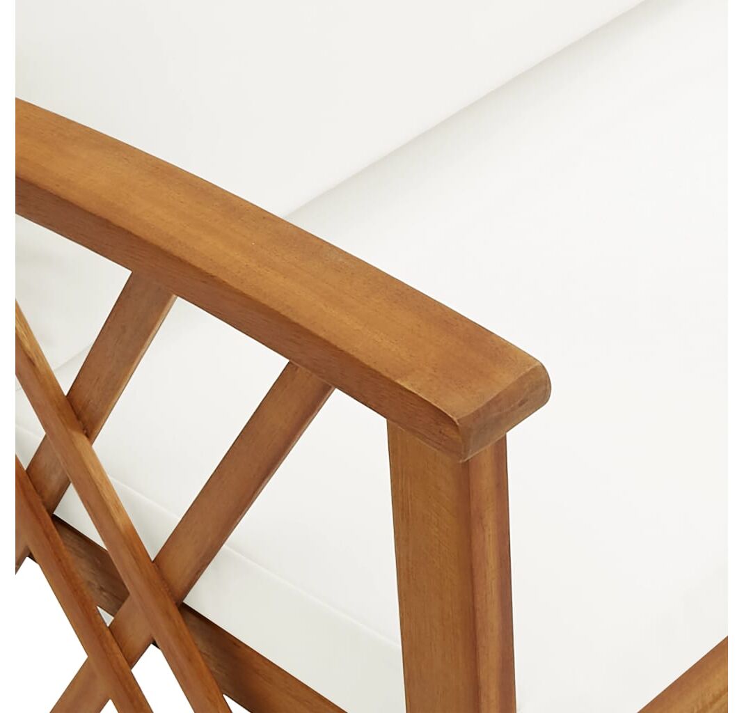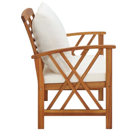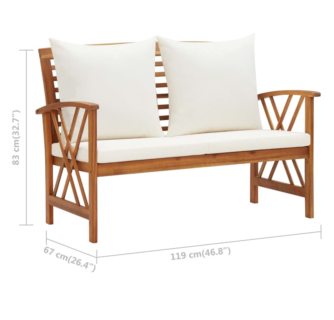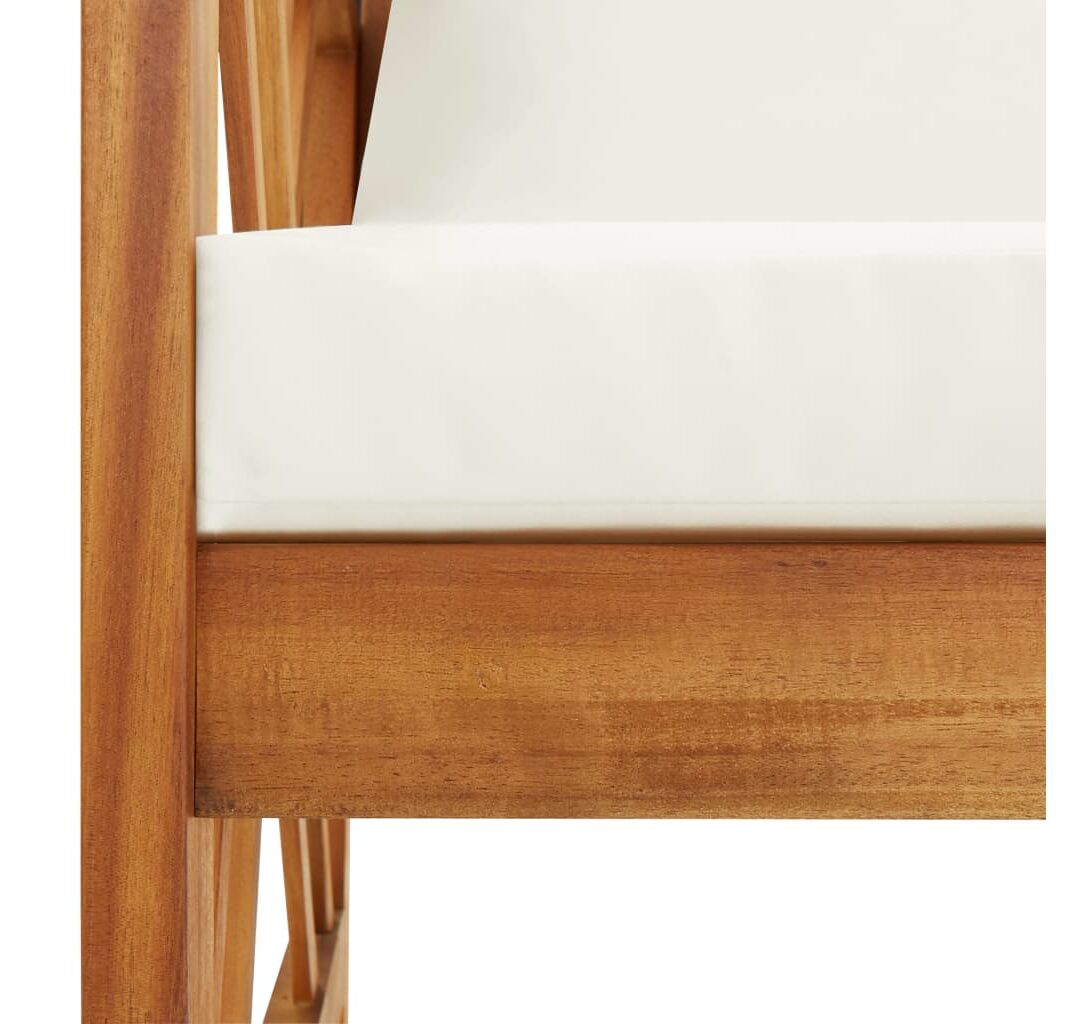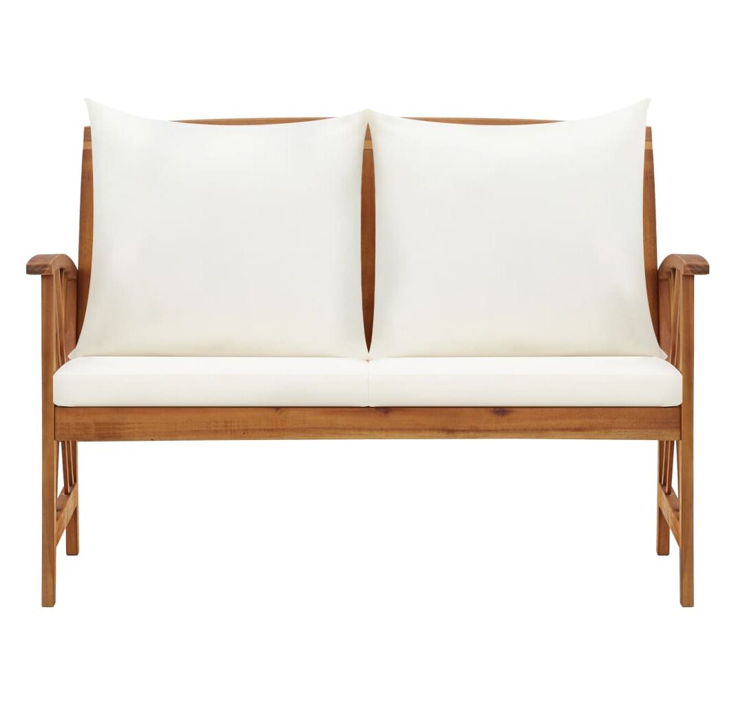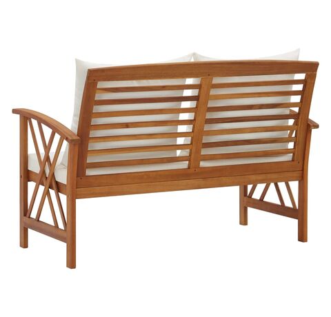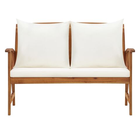 Această bancă de exterior este fabricată din lemn masiv de acacia, un lemn de esență tare cu granulație densă. Banca frumos proiectată este stabilă, durabilă și atrăgătoare. Suprafața finisată cu ulei este ușor de curățat cu o cârpă umedă, fiind adecvată pentru utilizare în aer liber. Pernele de șezut și de spătar incluse asigură un conform optim de ședere. Banca din lemn este un loc ideal pentru relaxare, discuții cu membrii familiei în grădina, curtea sau balconul dvs.