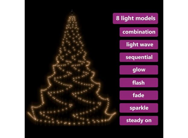 Pomul cu LED este format din 720 de LED-uri economice energetic, care emit o lumină puternică. Acest brad de Crăciun are șiraguri cu LED legate unul de altul, pentru o lumină strălucitoare la conectarea instalației. Proiectat cu 8 efecte diferite: o combinație a tuturor efectelor, strălucire lentă, sclipire / bliț, în undă, urmărire / curgere a apei, secvențială, constantă și decolorare lentă, această decorațiune se aprinde frumos și creează o atmosferă magică de sărbători. Această decorațiune de Crăciun este rezistentă la apă și, prin urmare, potrivită atât pentru utilizare în interior, cât și în exterior. Setul complet include 5 vârfuri, un cârlig și 15 legături de cablu pentru a configura un brad mare cu lumini LED.