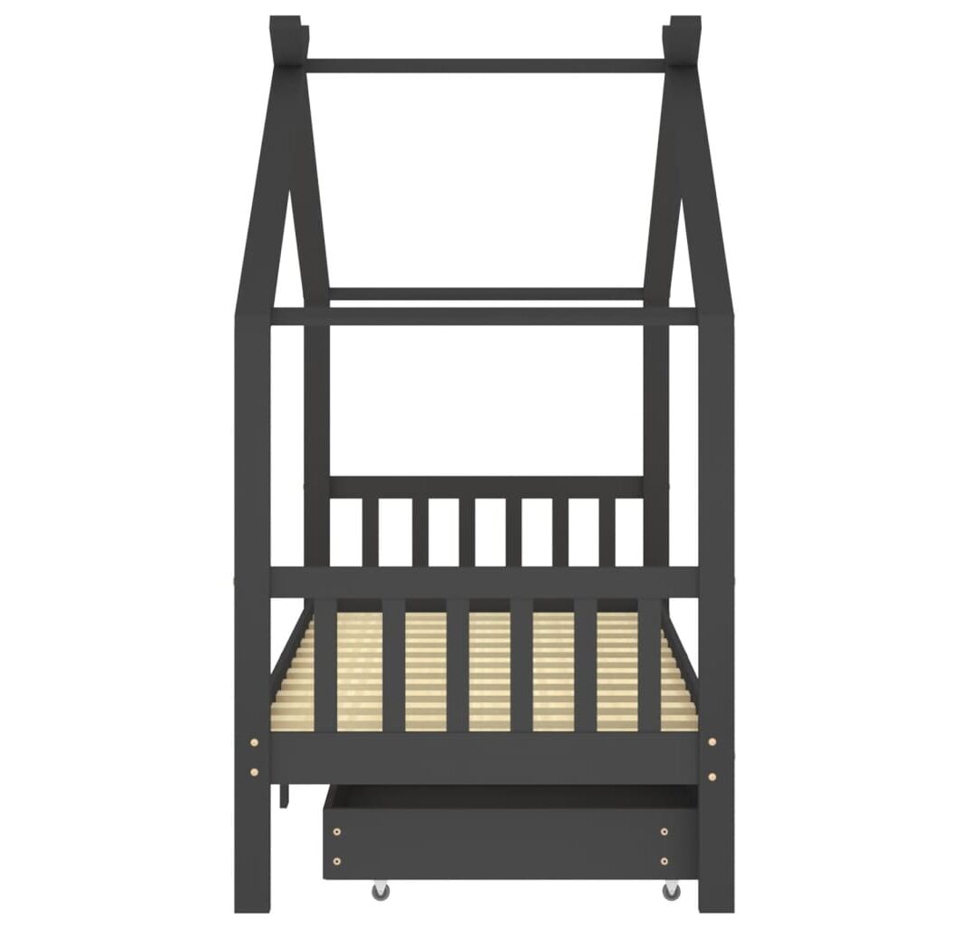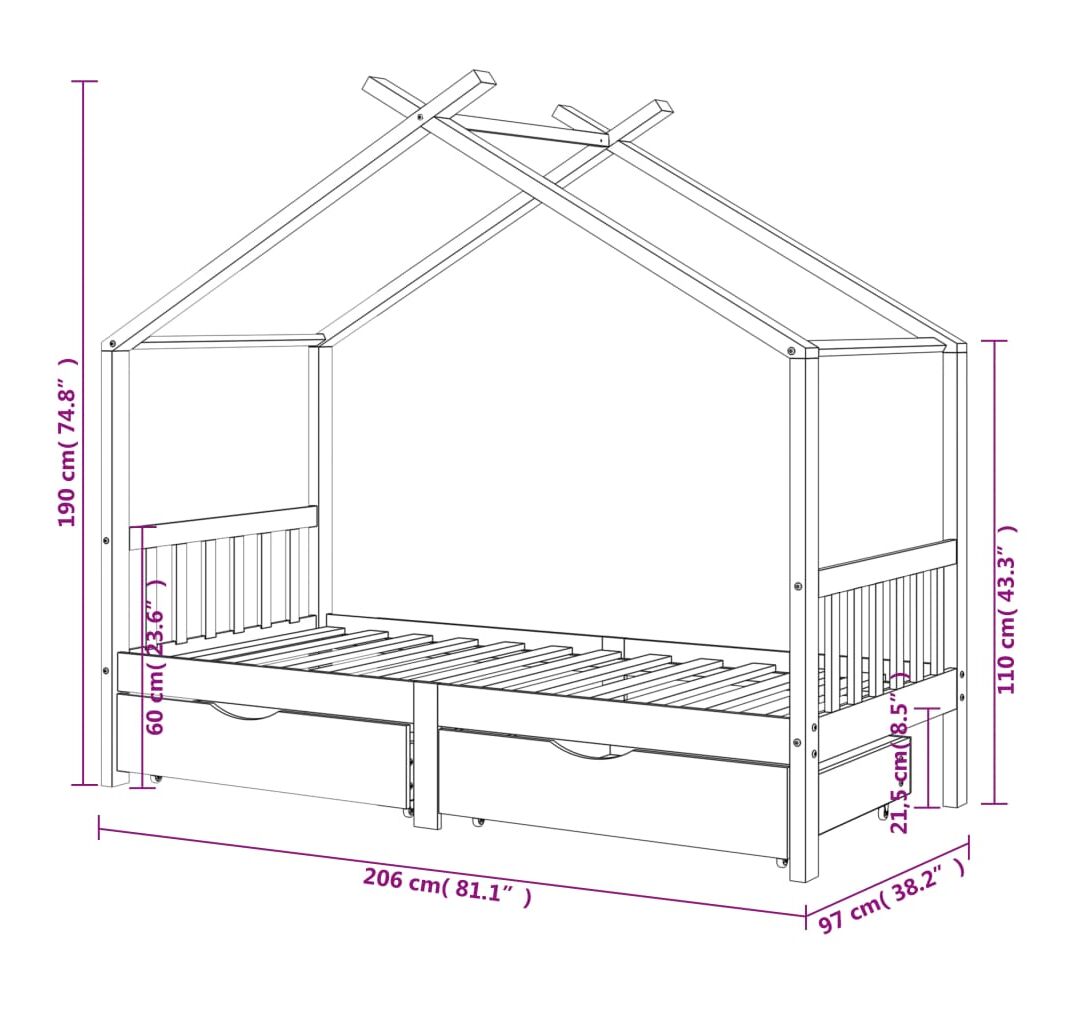 Patul este proiectat inteligent cu un cadru în stil de căsuță în copac, unde puteți agăța perdele de pat pentru a crea intimitate pentru copilul dumneavoastră. Poate fi folosit și drept loc de lectură sau de joacă pentru copilul dvs. Fabricat din lemn masiv de pin, acest cadru de pat este extrem de robust și durabil. Lamelele solide oferă suportul necesar și sunt extrem de confortabile. Sertarele de pat incluse oferă spațiu de depozitare amplu pentru depozitarea hainelor împăturite, a jucăriilor etc., menținând camera curată și ordonată. Roțile cu alunecare ușoară pot funcționa atât pe podele mochetate, cât și pe cele din lemn. Acest cadru de pat este potrivit pentru o saltea de 90 x 200 cm.