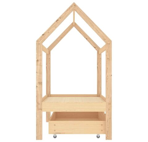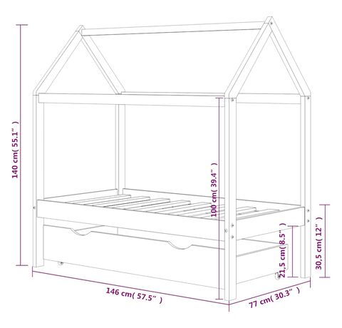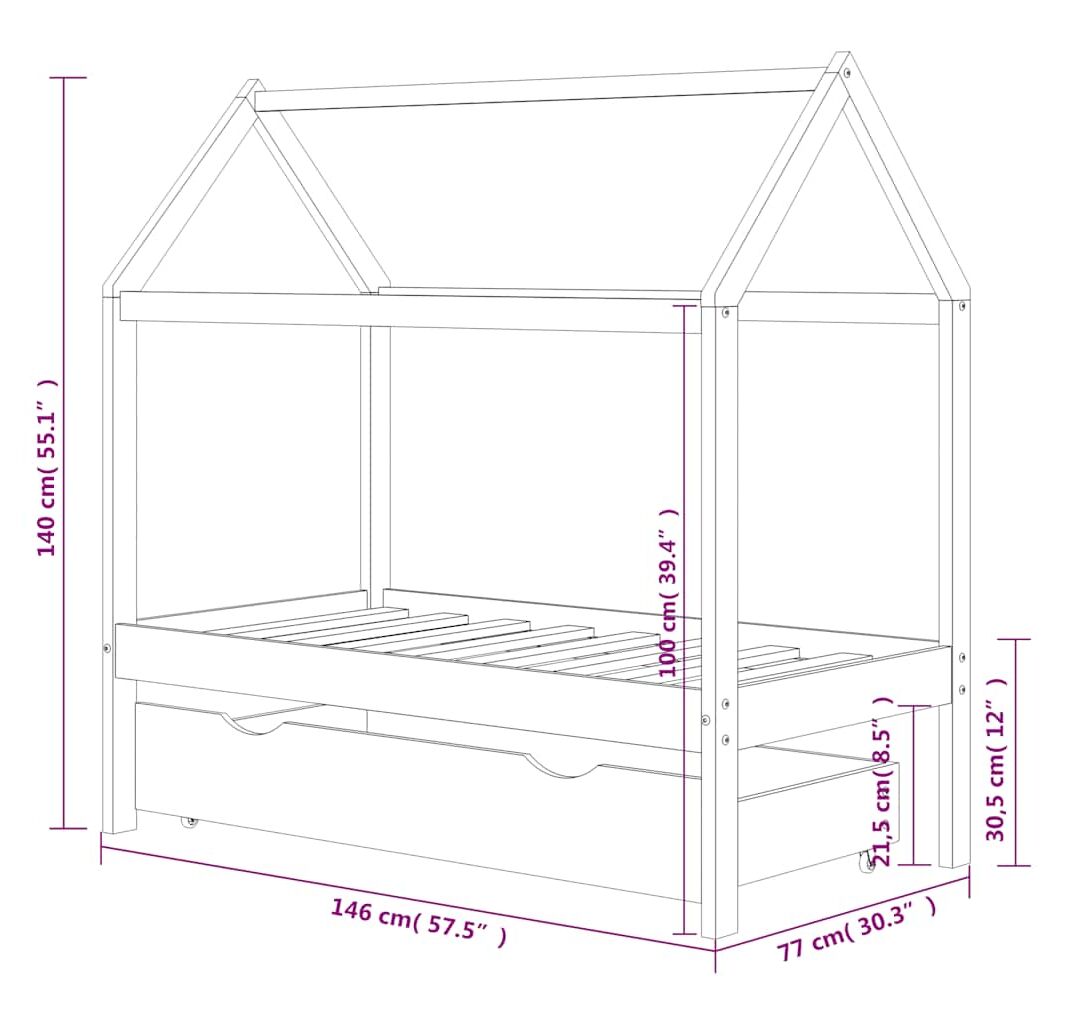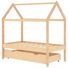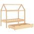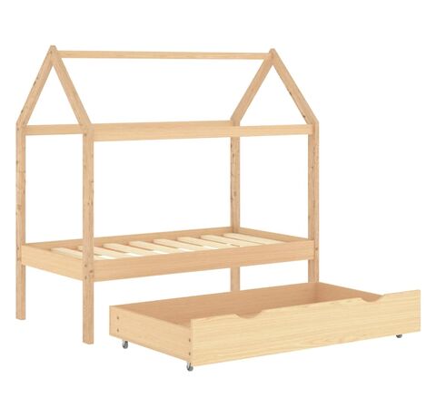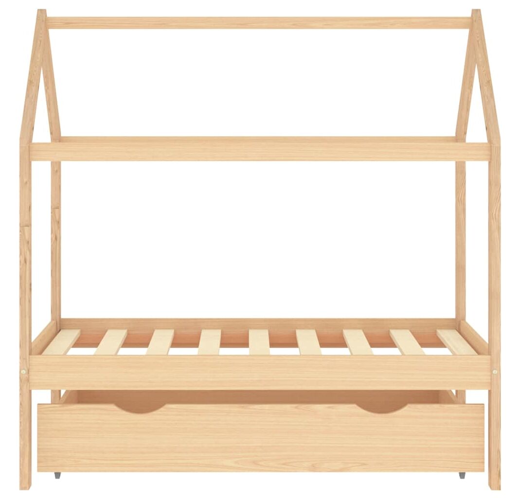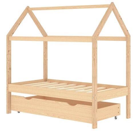 Patul este proiectat inteligent cu un cadru în stil de casă în copac, unde puteți agăța perdele pentru a crea intimitate pentru copilul dumneavoastră. Poate fi folosit și drept loc de lectură sau de joacă pentru copilul dvs. Fabricat din lemn masiv de pin, acest cadru de pat este extrem de robust și durabil. Lamelele solide oferă suportul necesar și sunt extrem de confortabile. Sertarul de pat inclus, cu 2 mânere, oferă spațiu de depozitare amplu pentru depozitarea hainelor pliate, a jucăriilor etc., menținându camera curată și ordonată. Roțile cu alunecare ușoară pot funcționa atât pe podele mochetate, cât și pe cele din lemn. Acest cadru de pat este potrivit pentru o saltea de 70 x 140 cm.