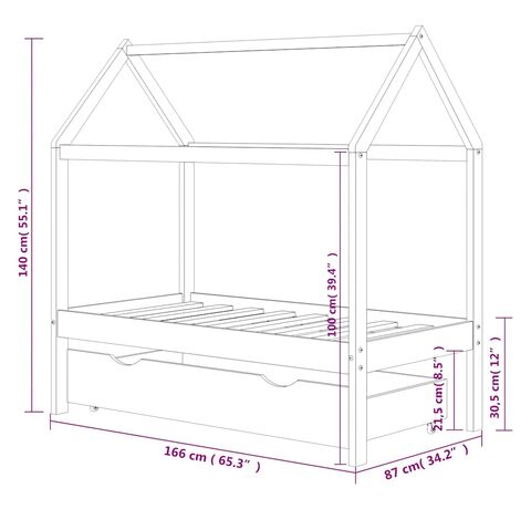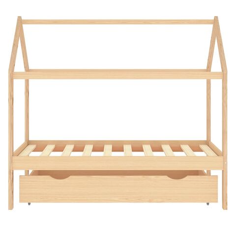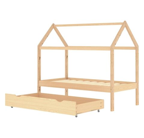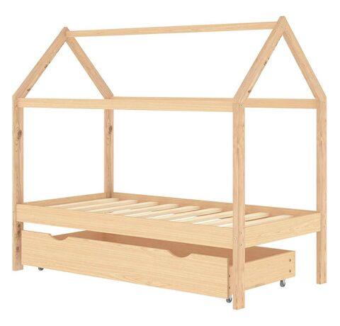 Patul este proiectat inteligent cu un cadru în stil de căsuță în copac, unde puteți agăța perdele pentru a crea intimitate pentru copilul dumneavoastră. Poate fi folosit și drept loc de lectură sau de joacă pentru copilul dvs. Fabricat din lemn masiv de pin, acest cadru de pat este extrem de robust și durabil. Lamelele solide oferă suportul necesar și sunt extrem de confortabile. Sertarul de pat inclus, cu 2 mânere, oferă spațiu de depozitare amplu pentru depozitarea hainelor împăturite, a jucăriilor etc., menținând camera curată și ordonată. Roțile cu alunecare ușoară pot funcționa atât pe podele mochetate, cât și pe cele din lemn. Acest cadru de pat este potrivit pentru o saltea de 80 x 160 cm.