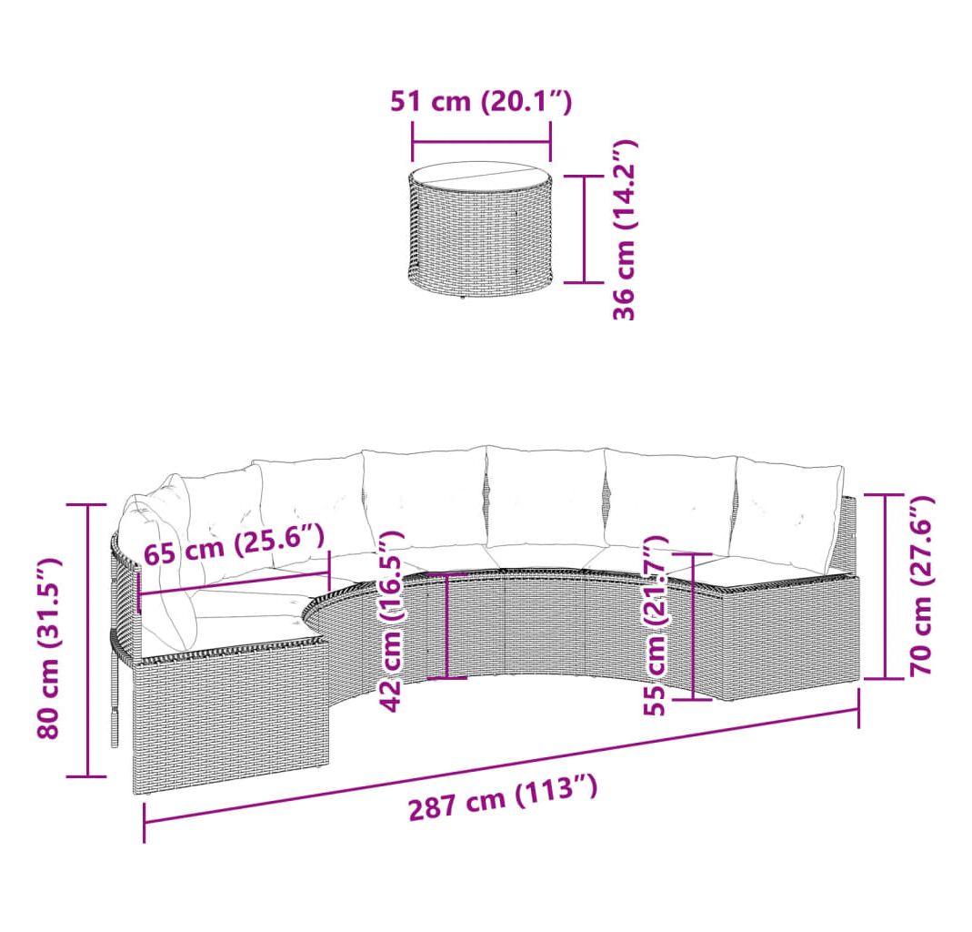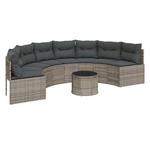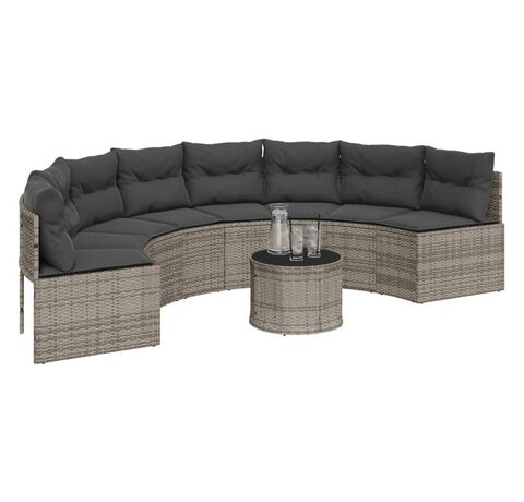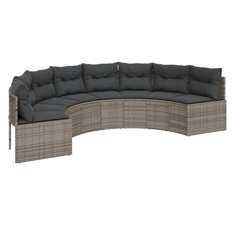 Această canapea de grădină, în formă semi-rotundă, este completarea perfectă pentru grădina, terasa sau curtea dvs., oferind un spațiu confortabil și primitor pentru a discuta cu familia și prietenii sau pur și simplu pentru a vă relaxa și a vă bucura de aer liber.