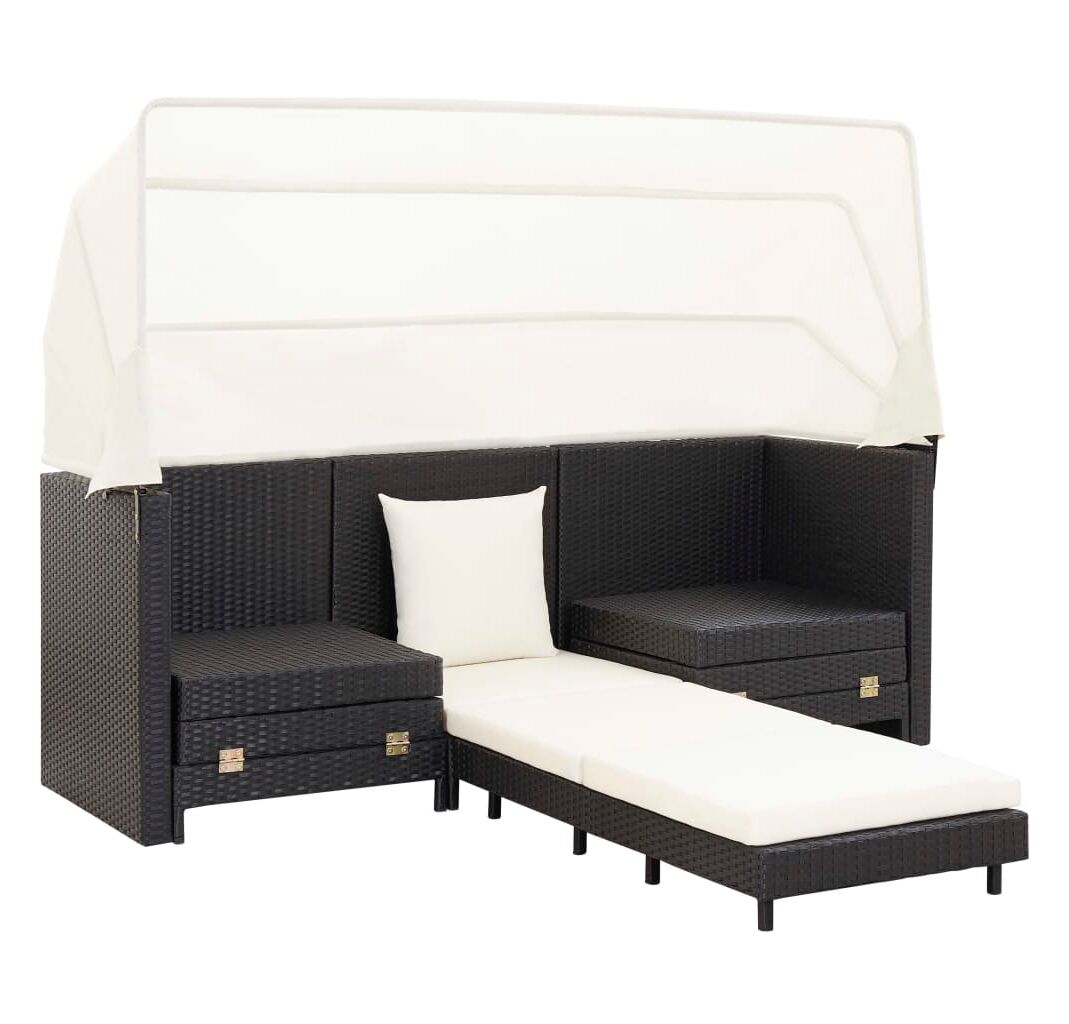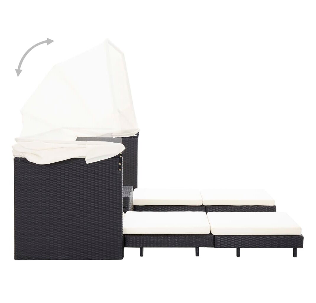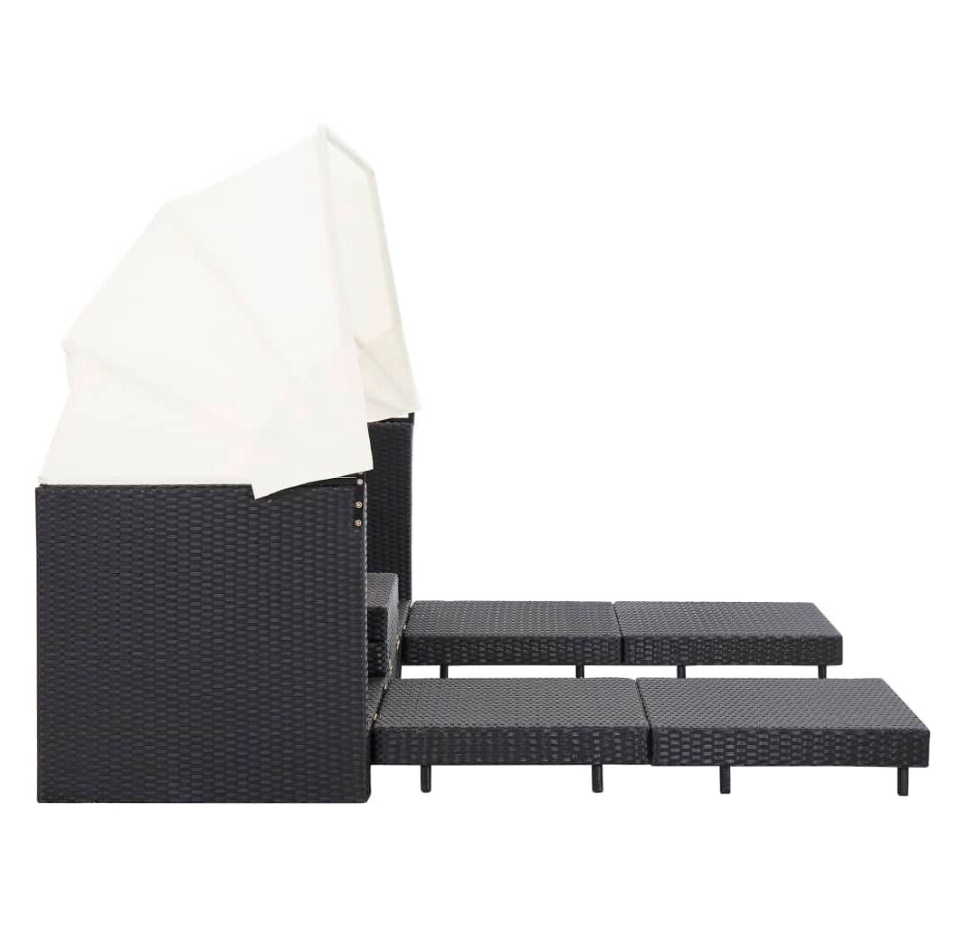 Datorită ratanului PE rezistent la intemperii, canapeaua este ușor de curățat, durabilă și potrivită pentru utilizarea zilnică. Cadrul din oțel vopsit electrostatic adaugă rezistență și stabilitate canapelei. Pernele sale moi, căptușite în strat gros, sunt foarte confortabile și fac din canapeaua extensibilă locul perfect pentru relaxare. Această canapea poate fi transformată cu ușurință într-un pat cu 1, 2 sau 3 locuri, atunci când o extindeți, după necesități. În plus, copertina inclusă poate fi utilizată ca parasolar. Acest set este ușor de asamblat.