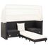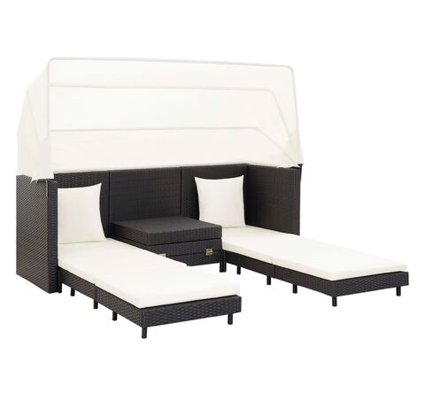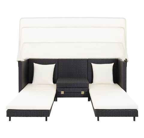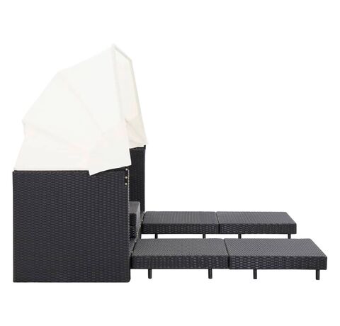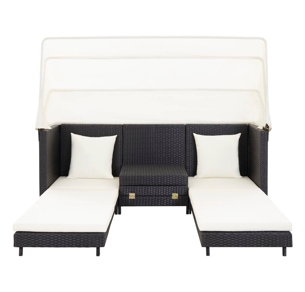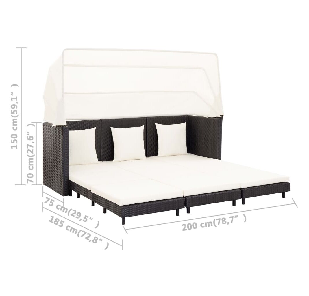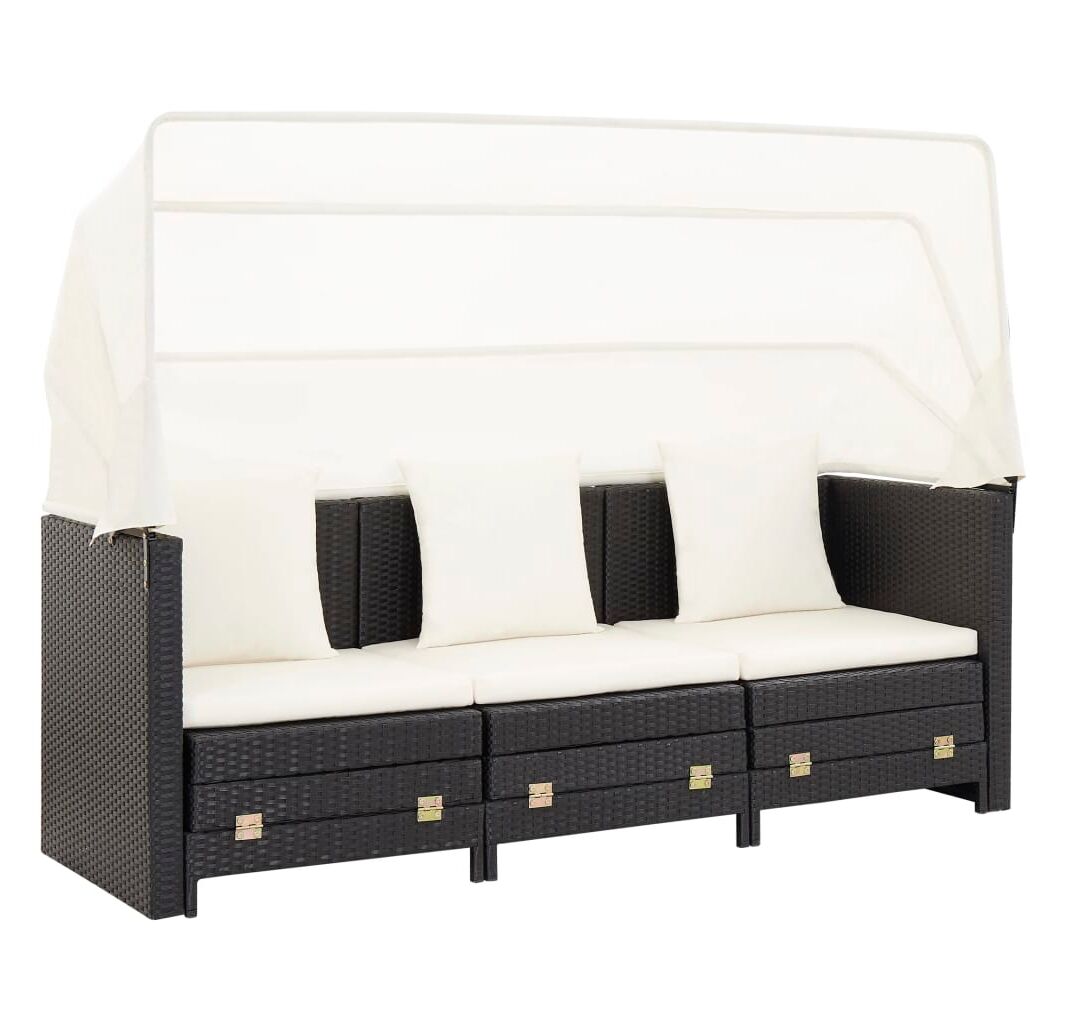 Datorită ratanului PE rezistent la intemperii, canapeaua este ușor de curățat, durabilă și potrivită pentru utilizarea zilnică. Cadrul din oțel vopsit electrostatic adaugă rezistență și stabilitate canapelei. Pernele sale moi, căptușite în strat gros, sunt foarte confortabile și fac din canapeaua extensibilă locul perfect pentru relaxare. Această canapea poate fi transformată cu ușurință într-un pat cu 1, 2 sau 3 locuri, atunci când o extindeți, după necesități. În plus, copertina inclusă poate fi utilizată ca parasolar. Acest set este ușor de asamblat.