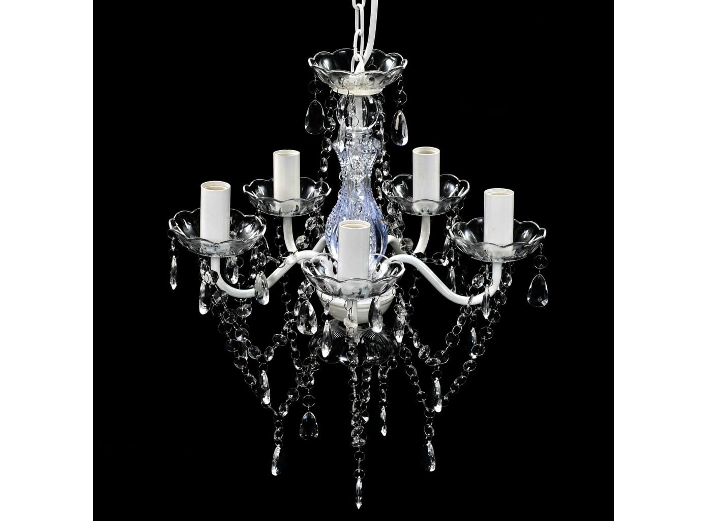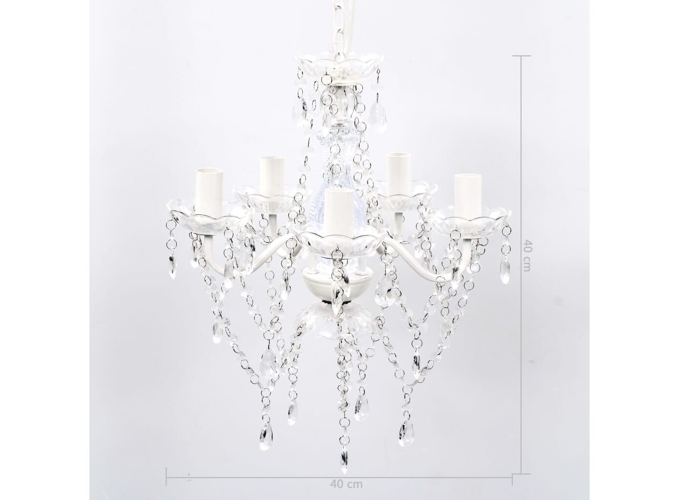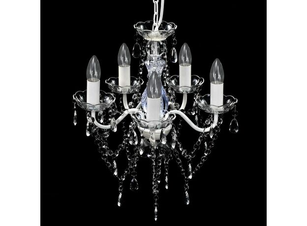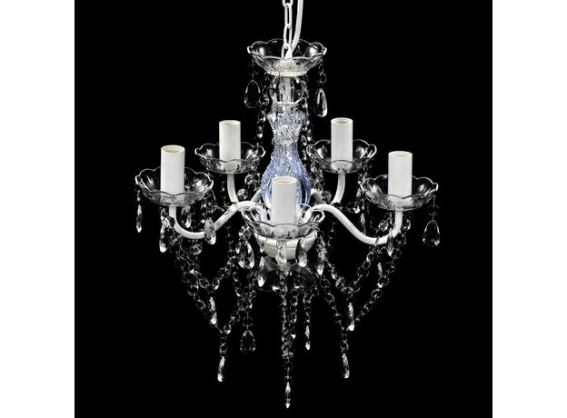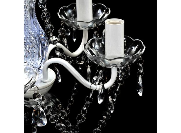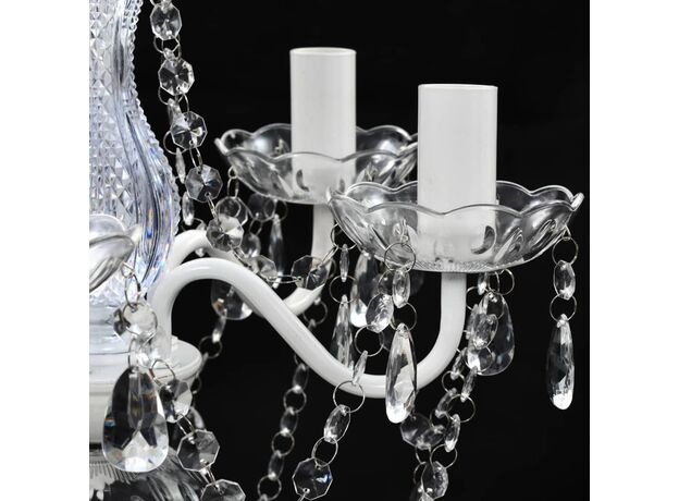Acest candelabru are o tijă centrală din sticlă de cristal frumos lucrată, cu brațe curbate acrilice, aplice și margele în picături. Puteți folosi atât becuri, cât și LED-uri.
