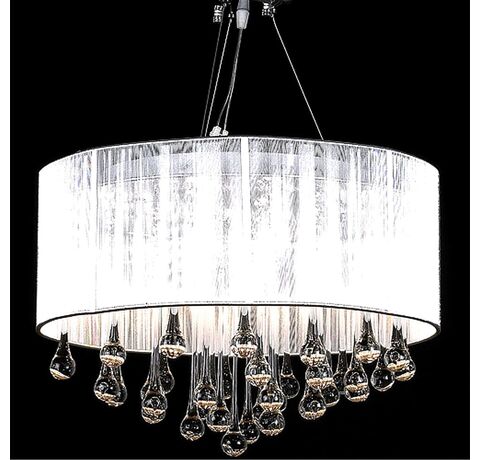 Candelabrul are o carcasă metalică care este cromată, candelabrul este acoperit cu un abajur alb translucid din fire. Lustra modernă are un design cu cristale regale. Sticla transparentă de înaltă calitate oferă o claritate reală și strălucește cu lumină puternică (chiar și din alte surse de lumină), iar în spectru va exista un joc magnific de culori.