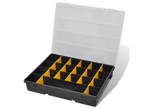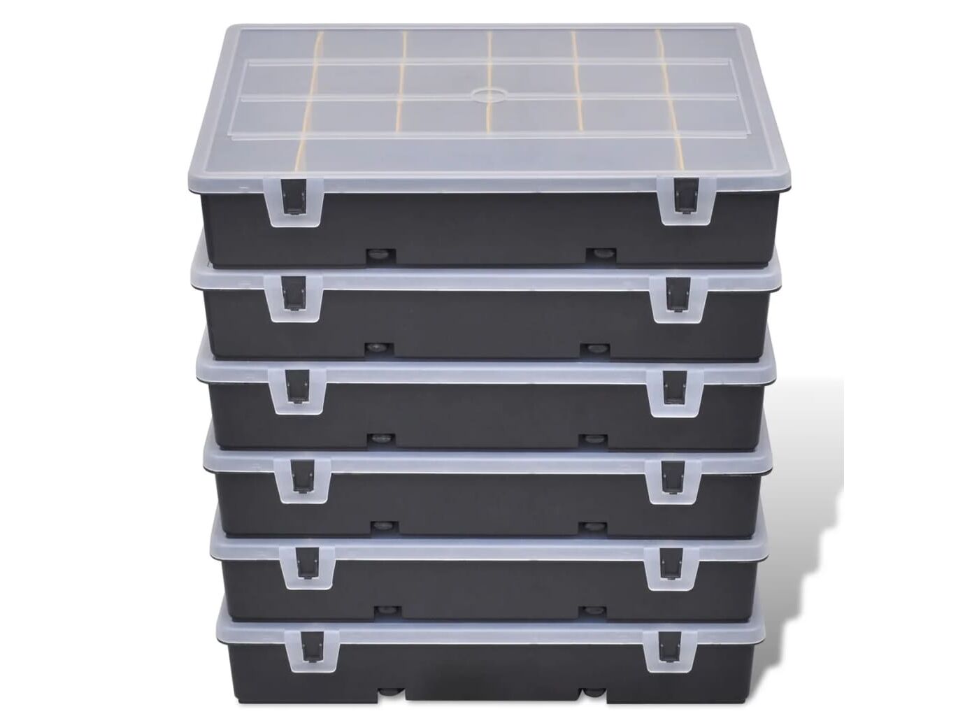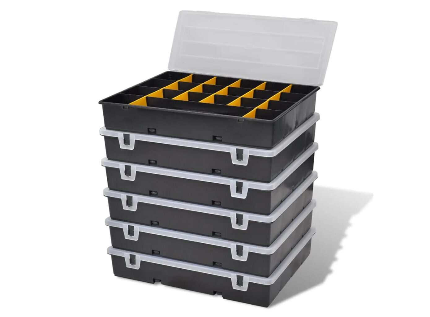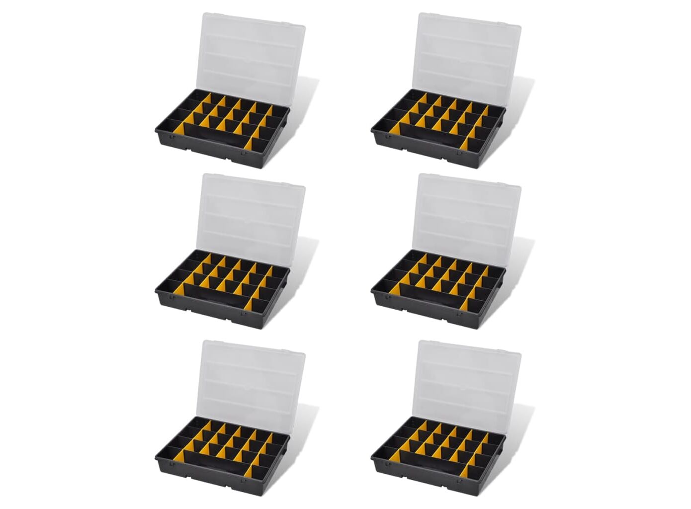Acest set robust cu cutie de scule din plastic, care include 6 bucăți, este ideal pentru depozitarea unor elemente precum piulițe, șuruburi și alte piese de mici dimensiuni. Fiecare cutie de scule dispune de 21 de compartimente, care, cu siguranță, vă vor ajuta să vă mențineți în ordine sculele de mici dimensiuni, aducând astfel confortul utilizării viitoare.