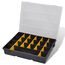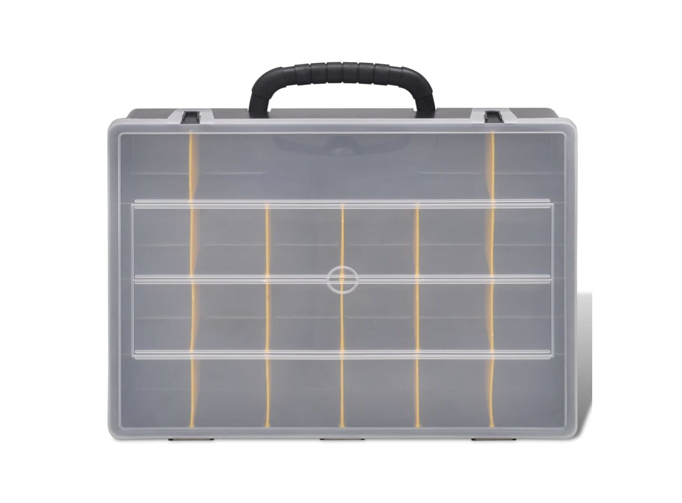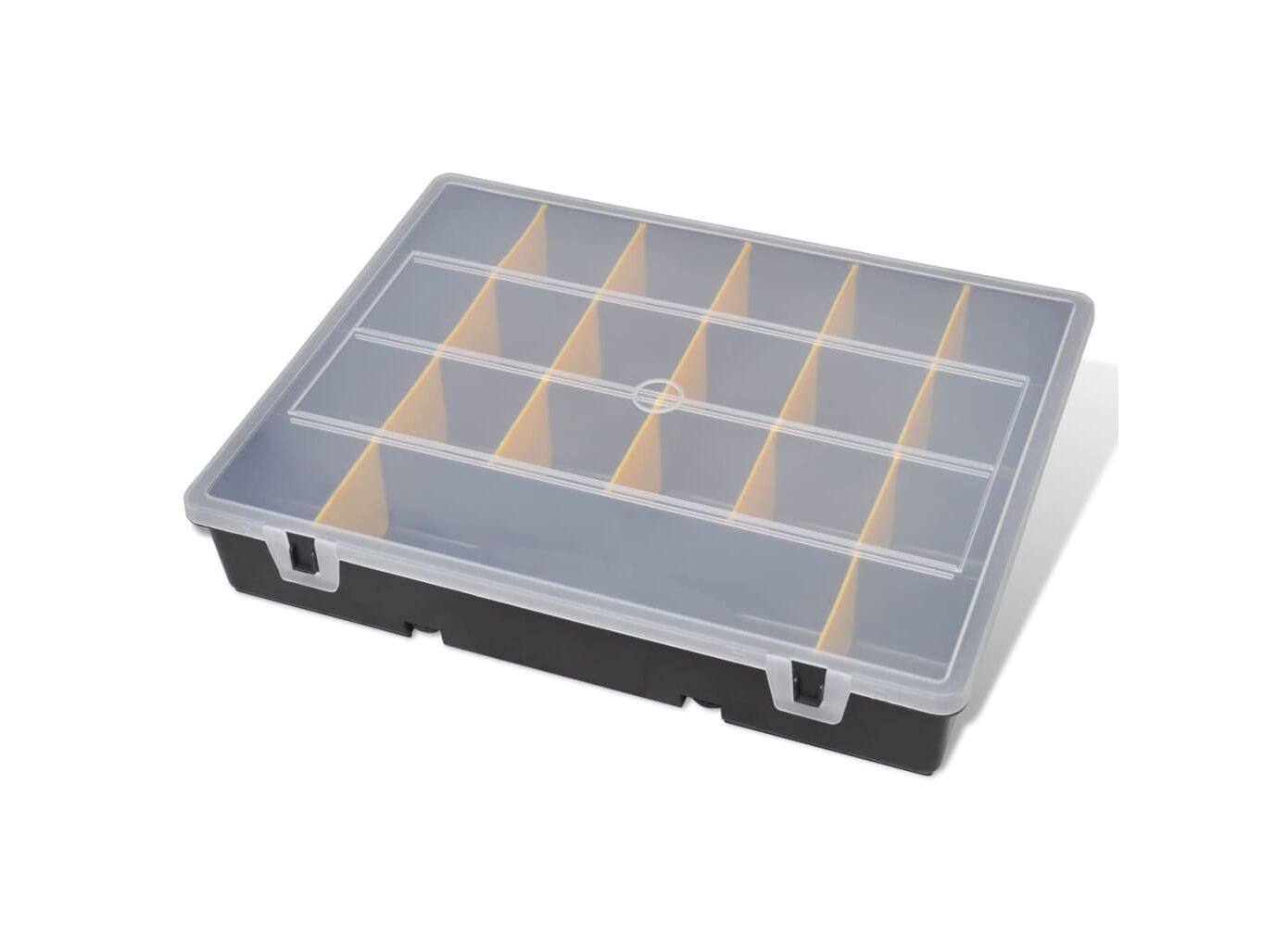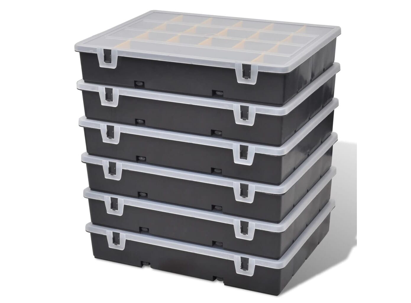 Acest set robust cu cutie de scule din plastic, care include 6 bucăți, este ideal pentru depozitarea unor elemente precum piulițe, șuruburi și alte piese de mici dimensiuni. Fiecare cutie de scule dispune de 21 de compartimente, care, cu siguranță, vă vor ajuta să vă mențineți în ordine sculele de mici dimensiuni, aducând astfel confortul utilizării viitoare.