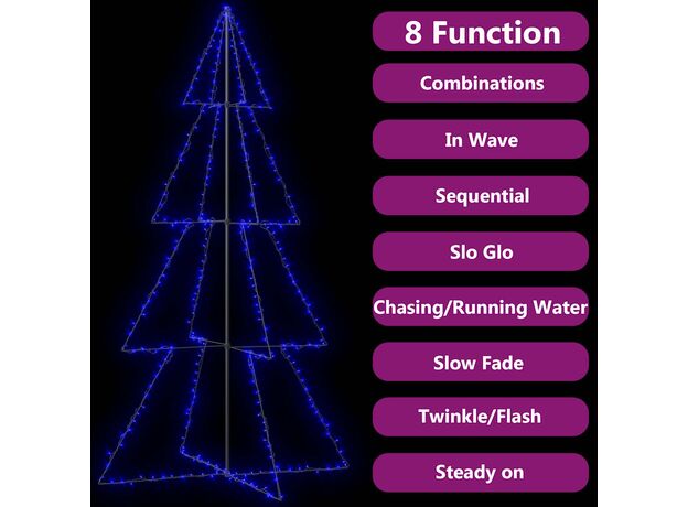 Luminile constau din 200 de LED-uri de mare putere, care sunt foarte eficiente din punct de vedere energetic și emit o lumină puternică. Este proiectat cu 8 efecte de iluminare diferite: o combinație a tuturor efectelor, strălucire lentă, sclipire/licărire, în unde, alergare/curgere de apă, secvențială, constant aprinsă și decolorare lentă. Se aprinde frumos și creează o atmosferă magică de sărbători. Va fi un adevărat punct de atracție, mai ales seara, și servește și ca o sursă confortabilă de lumină ambientală. Bradul conic independent poate fi fixat ușor și sigur de sol cu materialele de montare incluse.