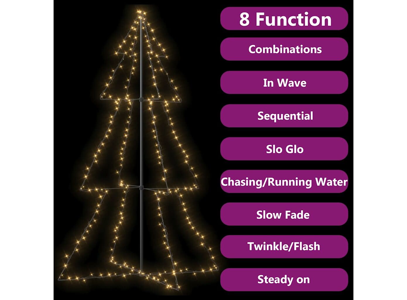 Luminile constau din 200 de LED-uri de mare putere, care sunt foarte eficiente din punct de vedere energetic și emit o lumină puternică. Este proiectat cu 8 efecte de iluminare diferite: o combinație a tuturor efectelor, strălucire lentă, sclipire/licărire, în unde, alergare/curgere de apă, secvențială, constant aprinsă și decolorare lentă. Se aprinde frumos și creează o atmosferă magică de sărbători. Va fi un adevărat punct de atracție, mai ales seara, și servește și ca o sursă confortabilă de lumină ambientală. Bradul conic independent poate fi fixat ușor și sigur de sol cu materialele de montare incluse.