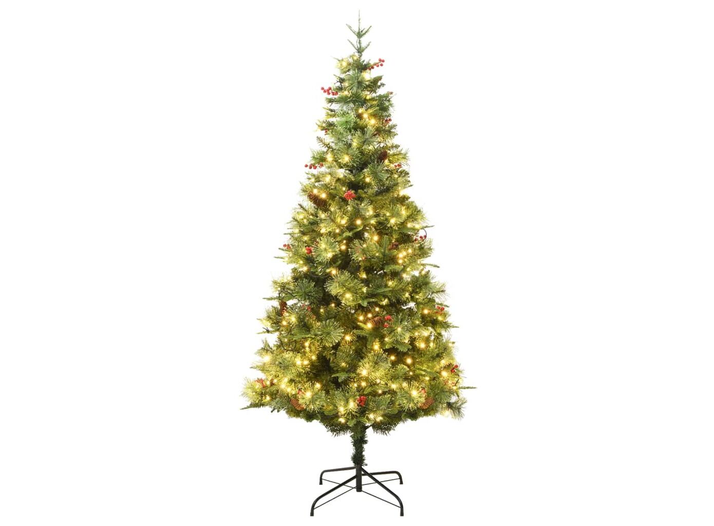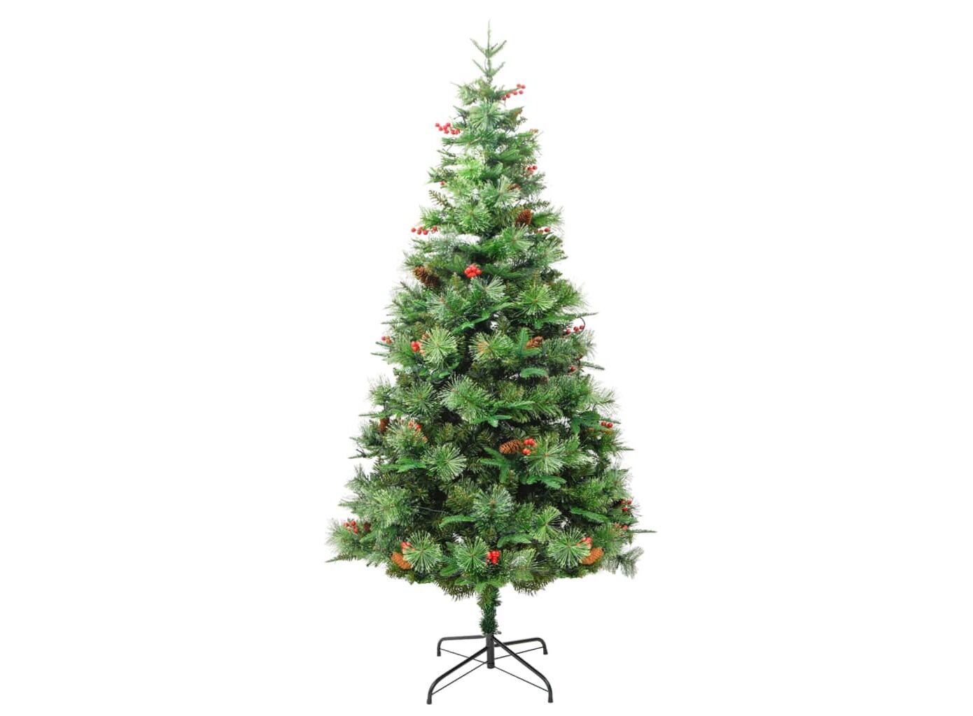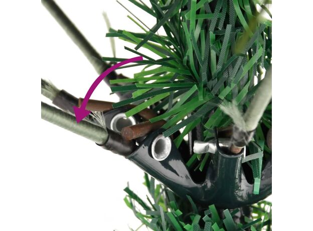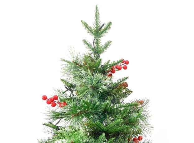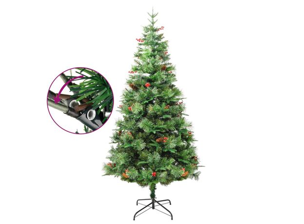 Acest frumos brad de Crăciun are ramuri din PVC și PE. În plus, suportul din oțel, inclus, oferă bradului o stabilitate optimă. Datorită luminilor LED, eficiente din punct de vedere energetic, este frumos iluminat și creează o atmosferă confortabilă de sărbătoare. Decorat de conuri de pin și fructe de pădure roșii presărate printre ace, acest pom de Crăciun va aduce orice casă la viață. Ramurile copacilor sunt atașate la tija centrală, folosind un sistem de tip balama. Datorită balamalelor, ramurile se vor deplasa automat în poziția corectă.