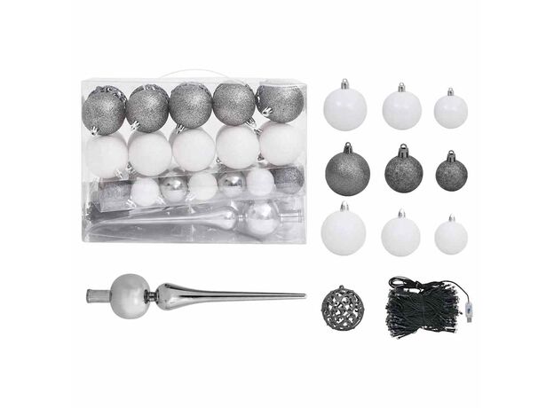 Acest pom de Crăciun alb, cu linii pure, este o piesă centrală uimitoare în cadrul decorațiunilor dvs. de Crăciun. Realizat din material PVC de calitate, arată ca un brad de Crăciun autentic. Bradul de Crăciun poate fi folosit din nou în fiecare an, ceea ce-l face o alegere foarte economică în comparație cu un brad natural. Poate fi utilizat doar în interior. Bradul de Crăciun este ușor de asamblat, datorită sistemului său simplu de conectare. Dispunând de lumini LED eficiente din punct de vedere energetic, bradul luminează frumos și creează o atmosferă confortabilă de sărbătoare. În plus, decorat cu vârf și globuri frumoase, acest brad de Crăciun va atrage atenția în locuința dvs.
