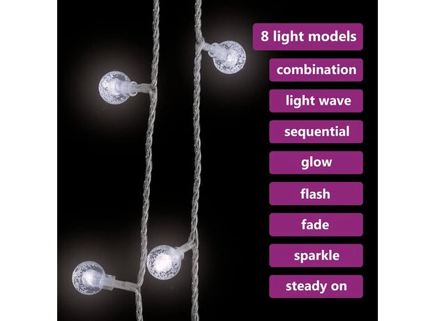 Instalația de lumini este echipată cu 400 de LED-uri economice energetic, creând o performanță de iluminare magică. Are 8 efecte de iluminare diferite: modul combinat, unde, modul secvențial, modul strălucitor încet, intermitent, modul de estompare lentă, sclipire și iluminare continuă. Este un accesoriu decorativ excelent pentru iluminarea spațiilor de interior și de exterior.