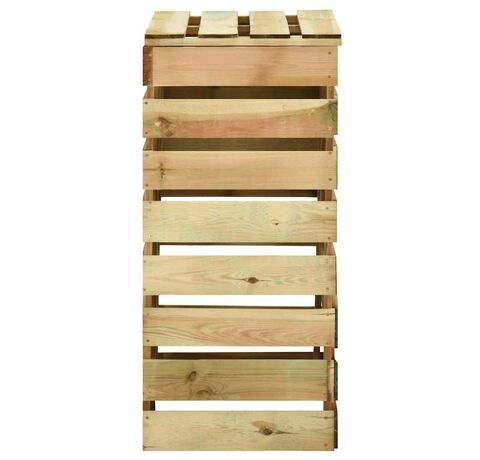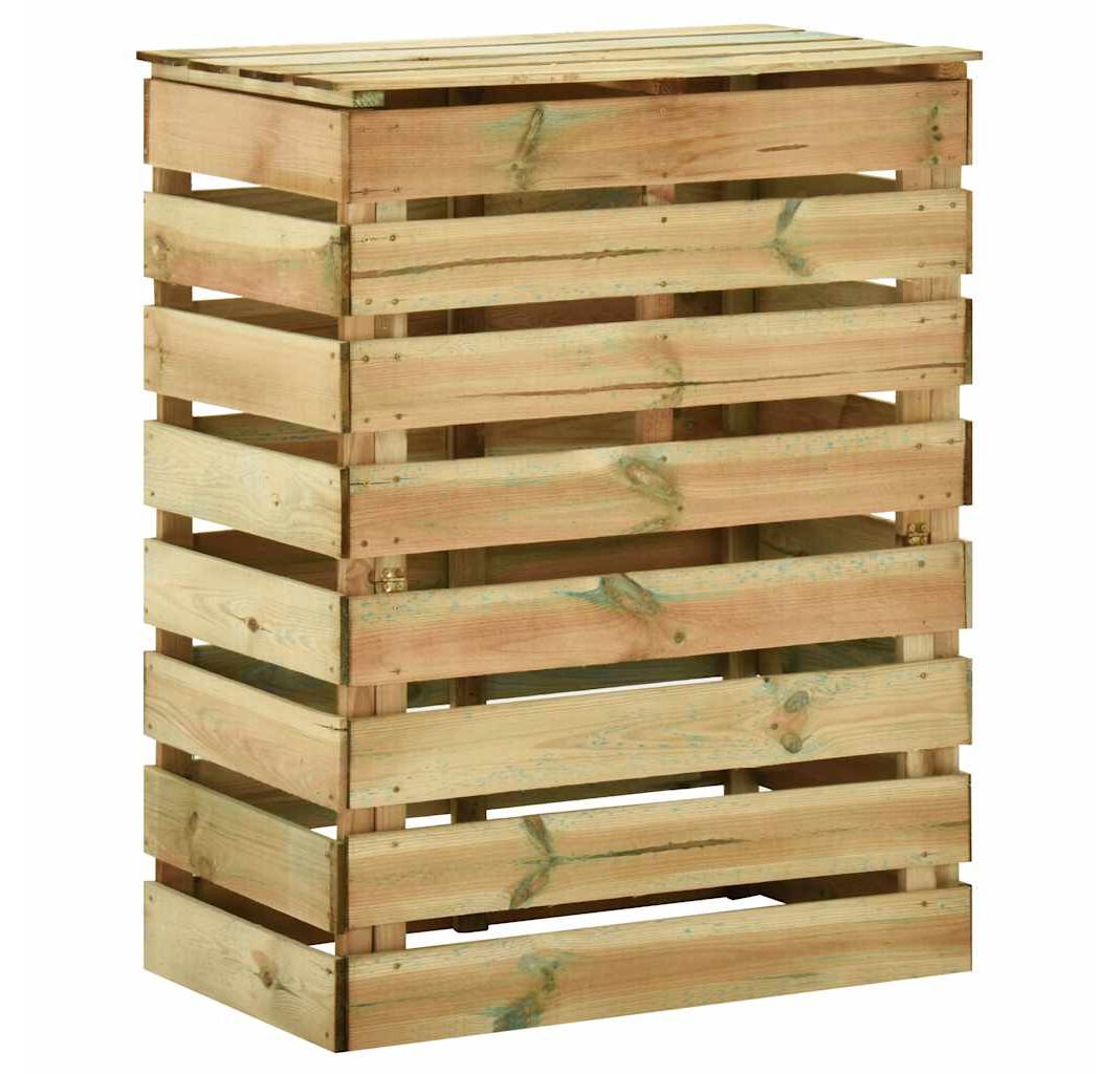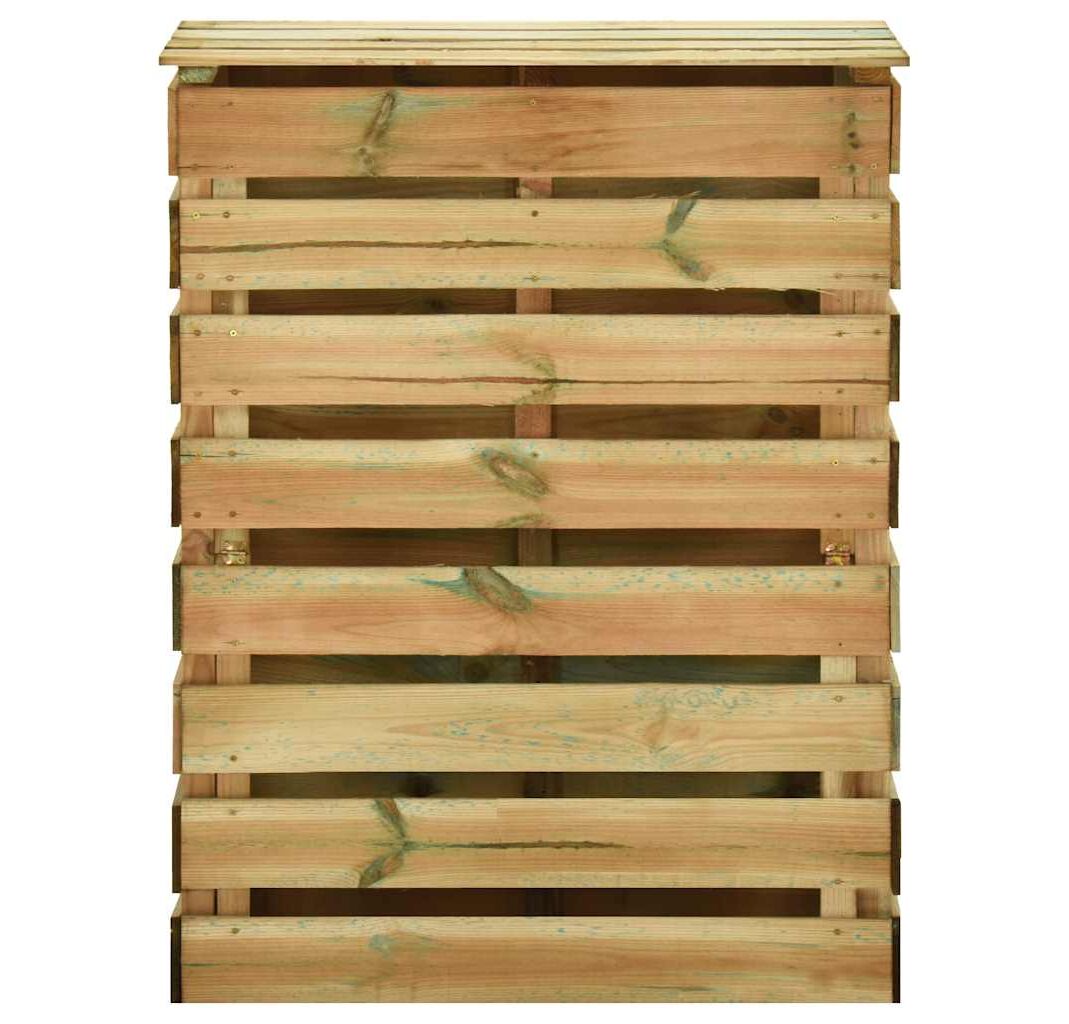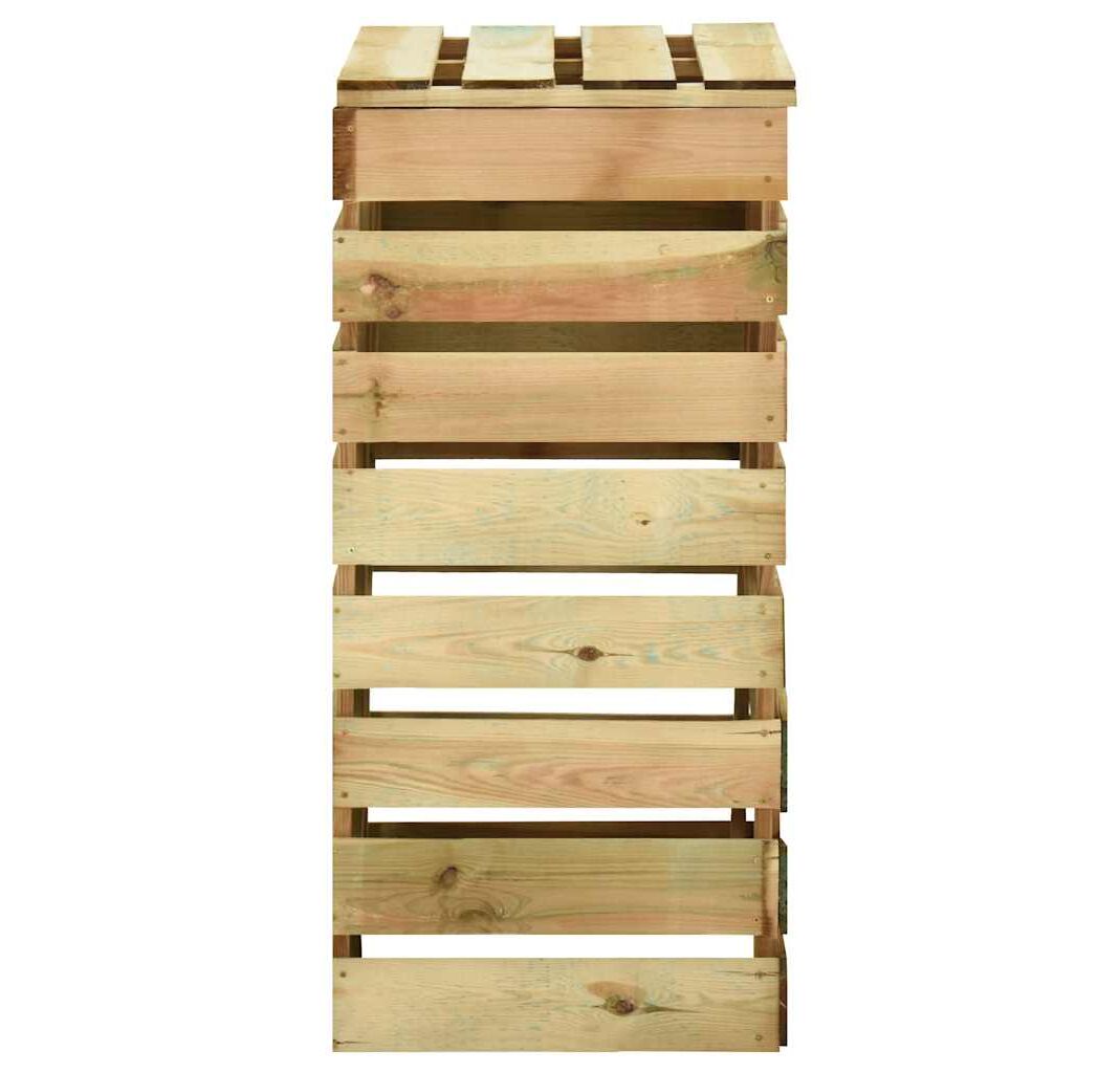 Compostorul de grădină are un design cu șipci, care asigură o bună circulație a aerului pentru compostare, transformând deșeurile organice în compost util bogat în nutrienți. Este fabricat din lemn de pin masiv, care este ecologic. Lemnul de pin tratat este durabil, rezistent la intemperii și la putrezire, fiind potrivit pentru utilizarea zilnică la exterior. Acest coș de compost, cu un capac, oferă soluția ideală pentru colectarea deșeurilor din grădină.