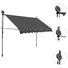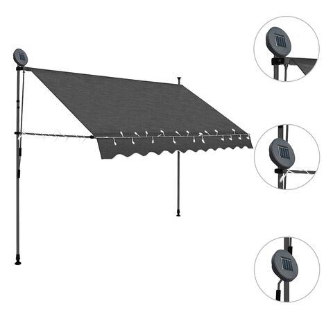Această copertină rezistentă la apă, murdărie, raze UV și intemperii este fabricată din poliester de calitate, cu un înveliș din PU. Cadrul robust din oțel asigură rezistență și durabilitate copertinei. Copertina din poliester este ușor de curățat și poate fi îndepărtată și spălată. Datorită manivelei, copertina este retractabilă. Înălțimea și unghiul de înclinare a copertinei pot fi de asemenea ajustate. În plus, luminile LED cu baterie solară asigură iluminatul economic peste noapte. Copertina este ușor de asamblat.