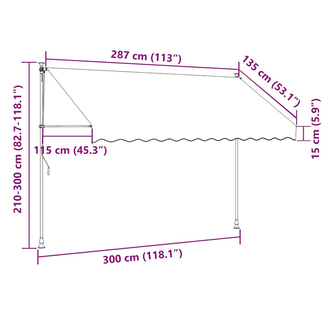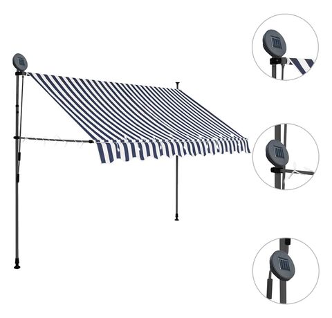 Această copertină rezistentă la apă, murdărie, raze UV și intemperii este fabricată din poliester de calitate, cu un înveliș din PU. Cadrul robust din oțel asigură rezistență și durabilitate copertinei. Copertina din poliester este ușor de curățat și poate fi îndepărtată și spălată. Datorită manivelei, copertina este retractabilă. Înălțimea și unghiul de înclinare a copertinei pot fi de asemenea ajustate. În plus, luminile LED cu baterie solară asigură iluminatul economic peste noapte. Copertina este ușor de asamblat.