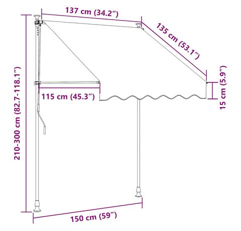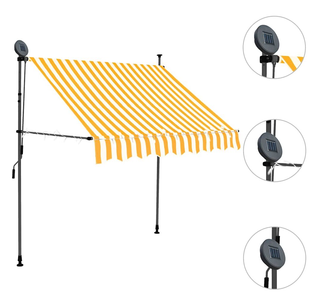 Această copertină rezistentă la apă, murdărie, raze UV și intemperii este fabricată din poliester de calitate, cu un înveliș din PU. Cadrul robust din oțel asigură rezistență și durabilitate copertinei. Copertina din poliester este ușor de curățat și poate fi îndepărtată și spălată. Datorită manivelei, copertina este retractabilă. Înălțimea și unghiul de înclinare a copertinei pot fi de asemenea ajustate. În plus, luminile LED cu baterie solară asigură iluminatul economic peste noapte. Copertina este ușor de asamblat.
