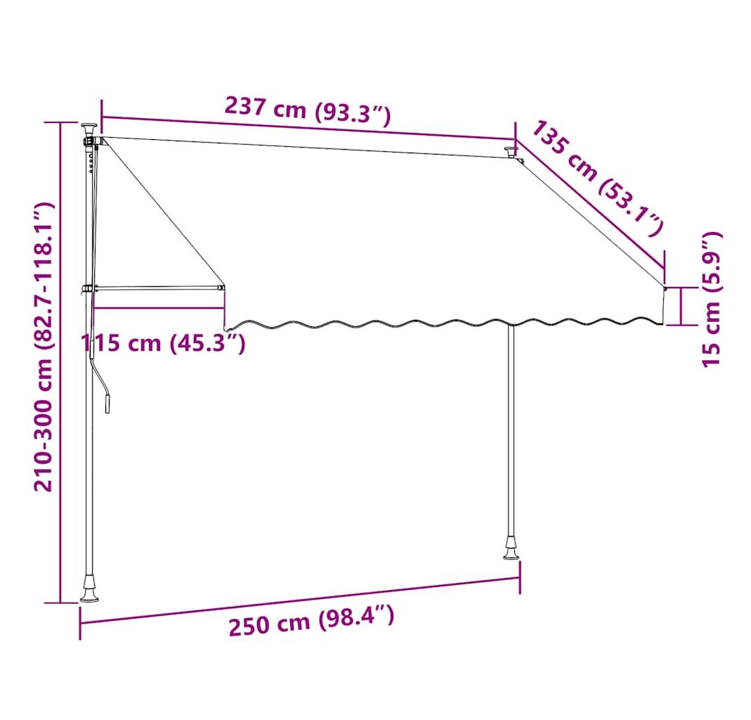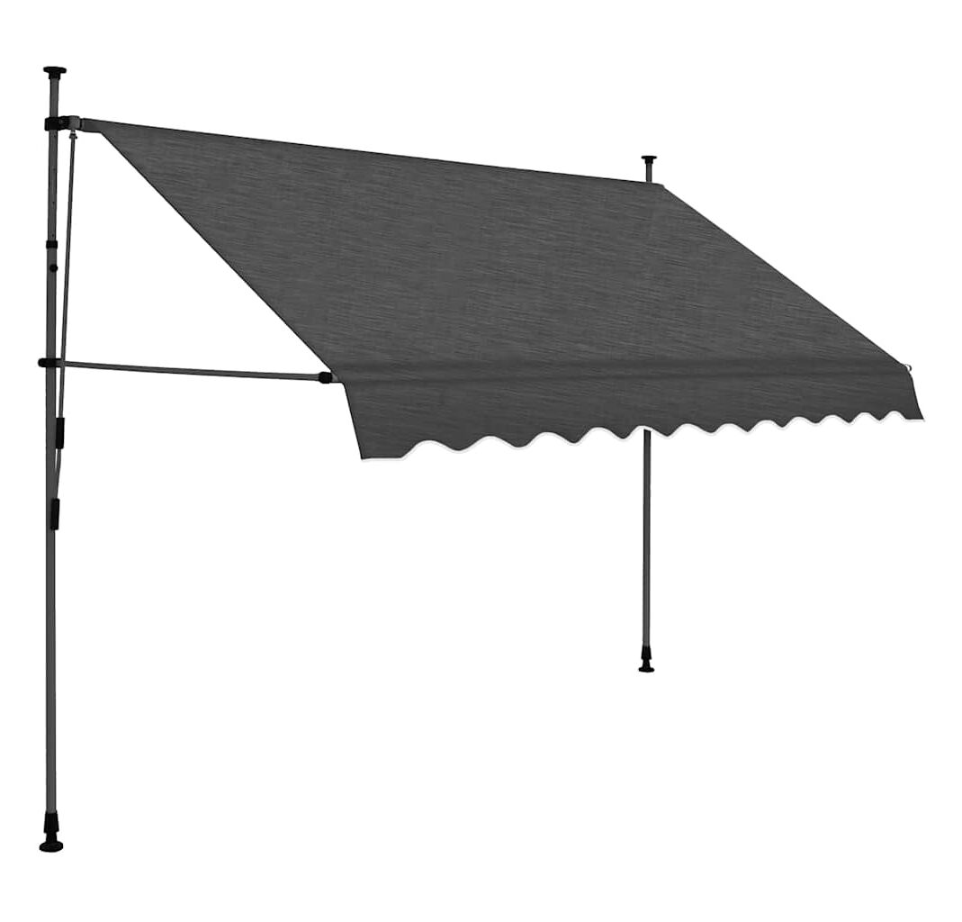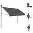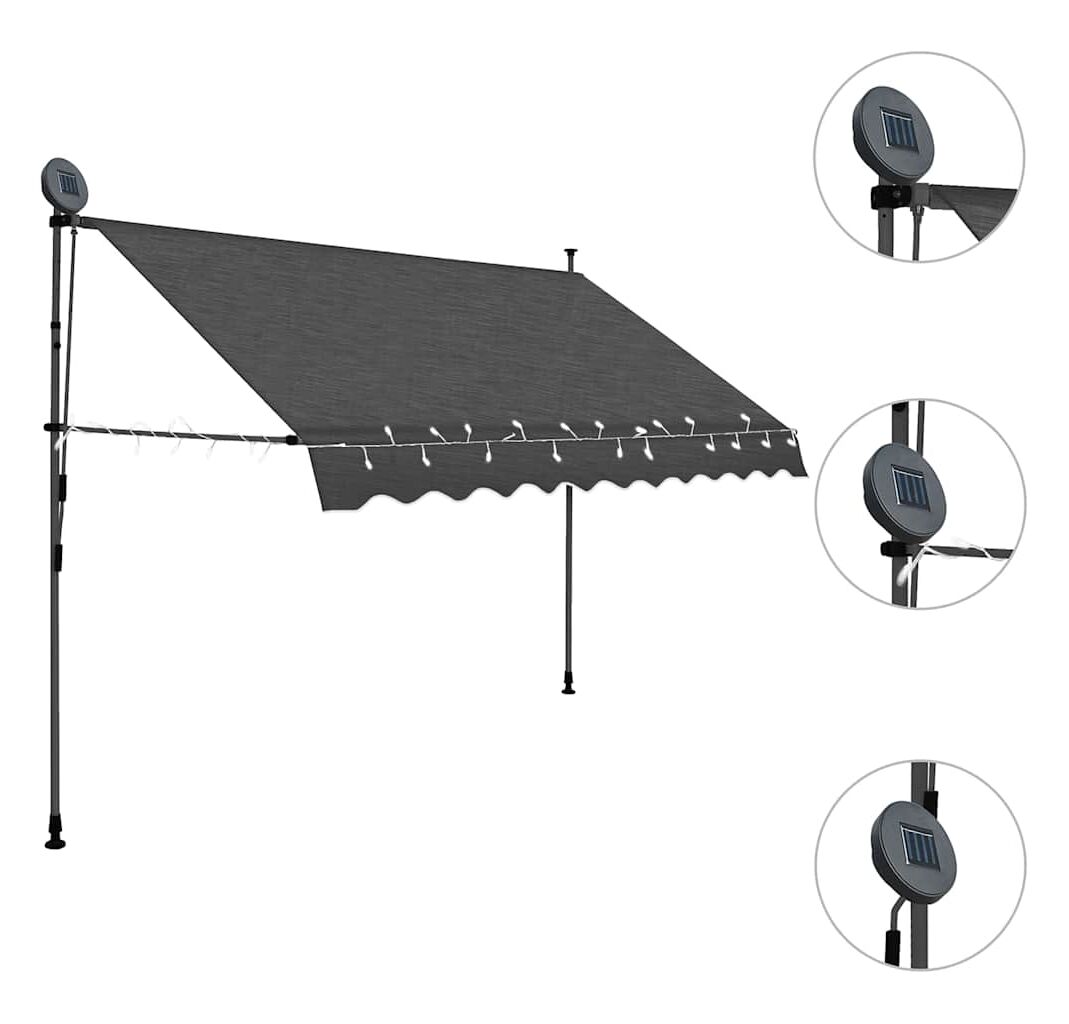 Această copertină rezistentă la apă, murdărie, raze UV și intemperii este fabricată din poliester de calitate, cu un înveliș din PU. Cadrul robust din oțel asigură rezistență și durabilitate copertinei. Copertina din poliester este ușor de curățat și poate fi îndepărtată și spălată. Datorită manivelei, copertina este retractabilă. Înălțimea și unghiul de înclinare a copertinei pot fi de asemenea ajustate. În plus, luminile LED cu baterie solară asigură iluminatul economic peste noapte. Copertina este ușor de asamblat.