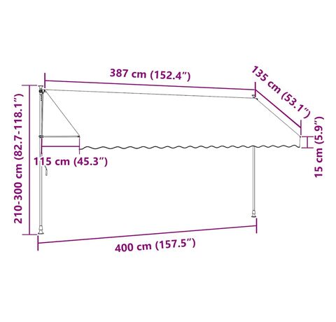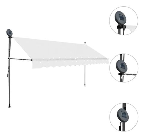 Această copertină rezistentă la apă, murdărie, raze UV și intemperii este fabricată din poliester de calitate, cu un înveliș din PU. Cadrul robust din oțel asigură rezistență și durabilitate copertinei. Copertina din poliester este ușor de curățat și poate fi îndepărtată și spălată. Datorită manivelei, copertina este retractabilă. Înălțimea și unghiul de înclinare a copertinei pot fi de asemenea ajustate. În plus, luminile LED cu baterie solară asigură iluminatul economic peste noapte. Copertina este ușor de asamblat.