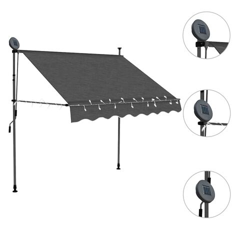 Această copertină rezistentă la apă, murdărie, raze UV și intemperii este fabricată din poliester de calitate, cu un înveliș din PU. Cadrul robust din oțel asigură rezistență și durabilitate copertinei. Copertina din poliester este ușor de curățat și poate fi îndepărtată și spălată. Datorită manivelei, copertina este retractabilă. Înălțimea și unghiul de înclinare a copertinei pot fi de asemenea ajustate. În plus, luminile LED cu baterie solară asigură iluminatul economic peste noapte. Copertina este ușor de asamblat.