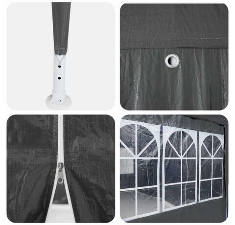 - Material Durabil: Făcut din țesătură din polietilenă impermeabilă, acest cort te ferește pe tine și invitații tăi de vreme nefavorabilă. Cadru din oțel robust adaugă stabilitate, asigurând o reuniune în siguranță.