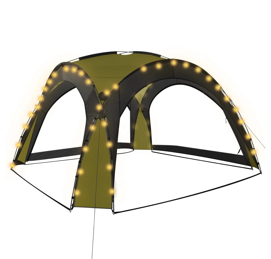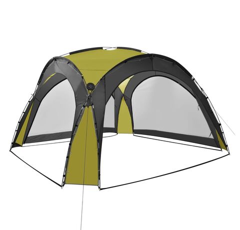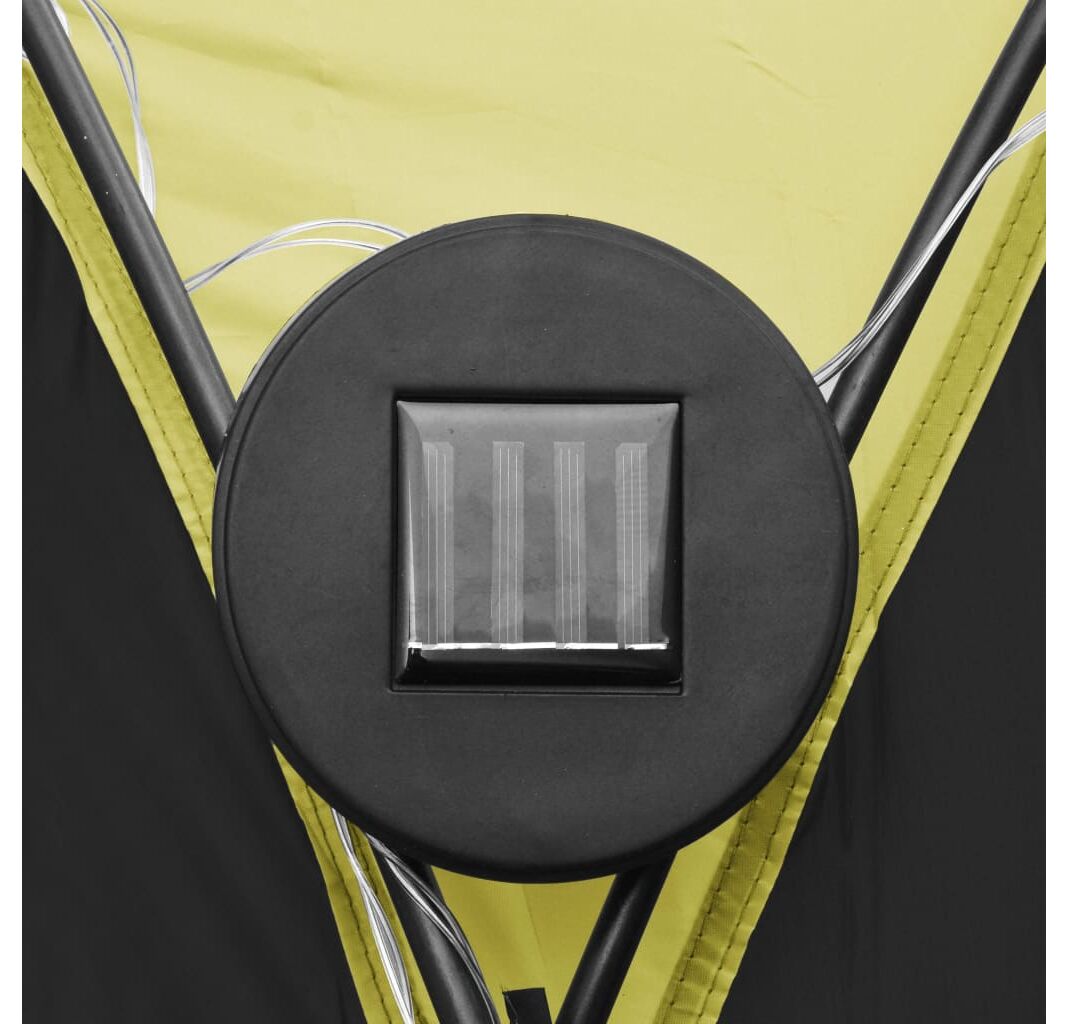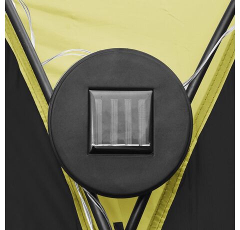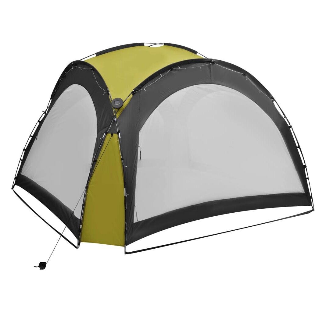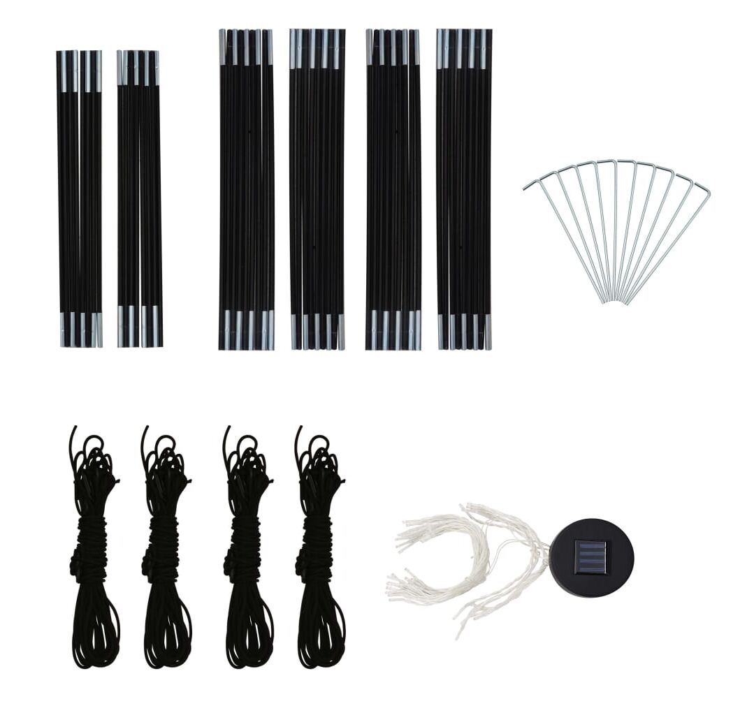Cortul de petrecere este confecționat dintr-o țesătură de poliester 100% cu înveliș din PA, fiind rezistent la raze UV. Cadrul este fabricat din fibră de sticlă robustă, fiind rezistent la rugină și având greutate redusă. Cei patru pereți laterali tip „plasă de țânțari” oferă o protecție ideală împotriva tuturor tipurilor de insecte. Fiind prevăzuți cu fermoar, aceștia pot fi atașați în câteva secunde. În plus, iluminatul cu 96 LED-uri poate fi pornit și oprit manual cu ușurință, iar modulul solar furnizat încarcă bateria integrată în timpul zilei.