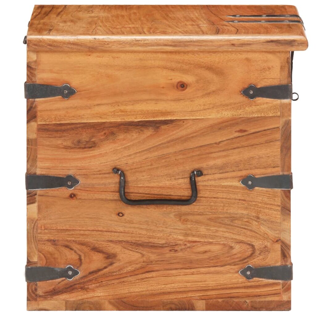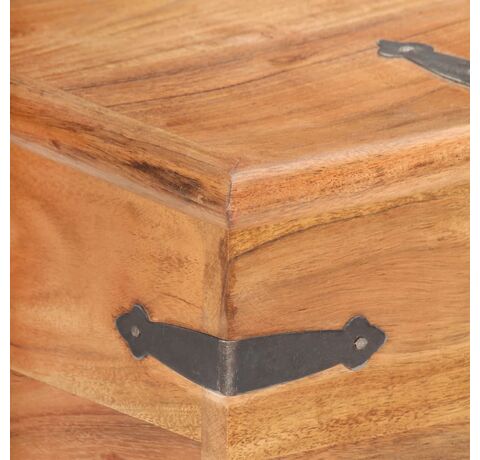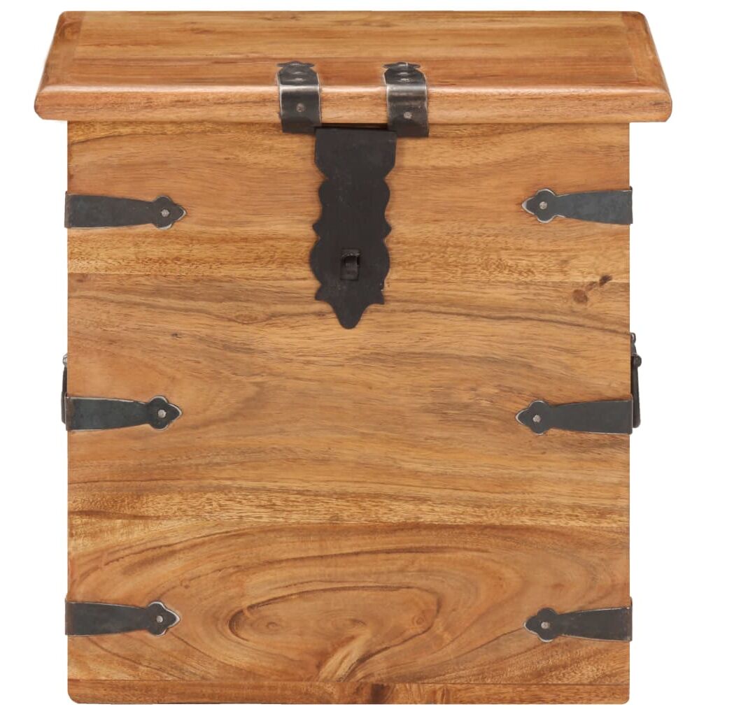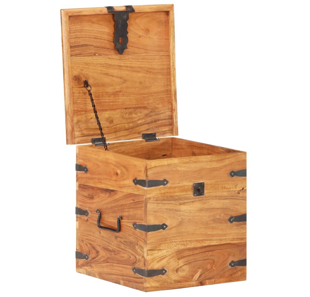 Cufărul este realizat din lemn masiv de acacia, făcându-l stabil și durabil. Are un zăvor în față și două mânere în lateral pentru a putea fi ridicat. Această ladă de depozitare, cu un blat neted, poate fi folosită și ca noptieră. Măiestria execuției și granulația frumoasă a lemnului fac fiecare piesă de mobilier unică și ușor diferită de celelalte.
