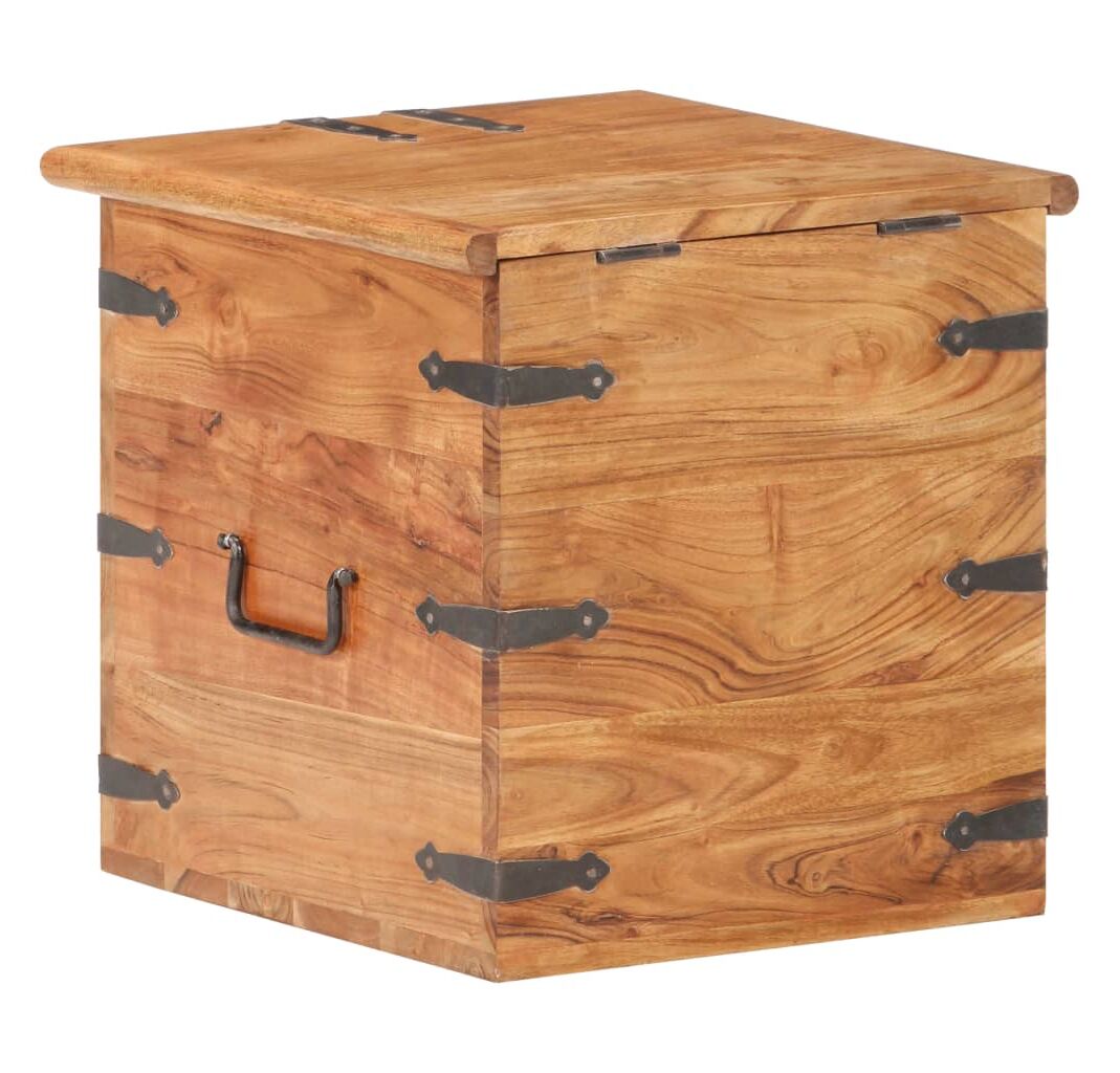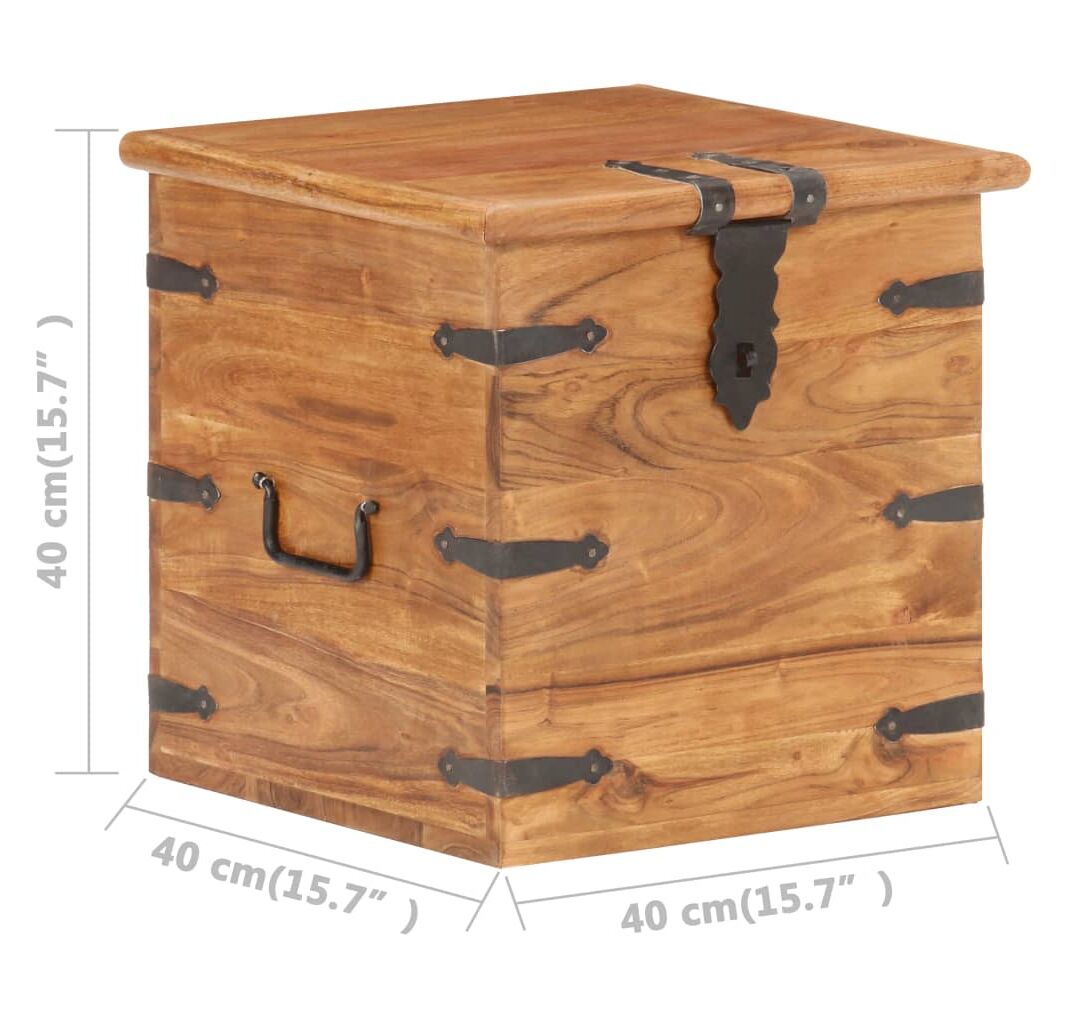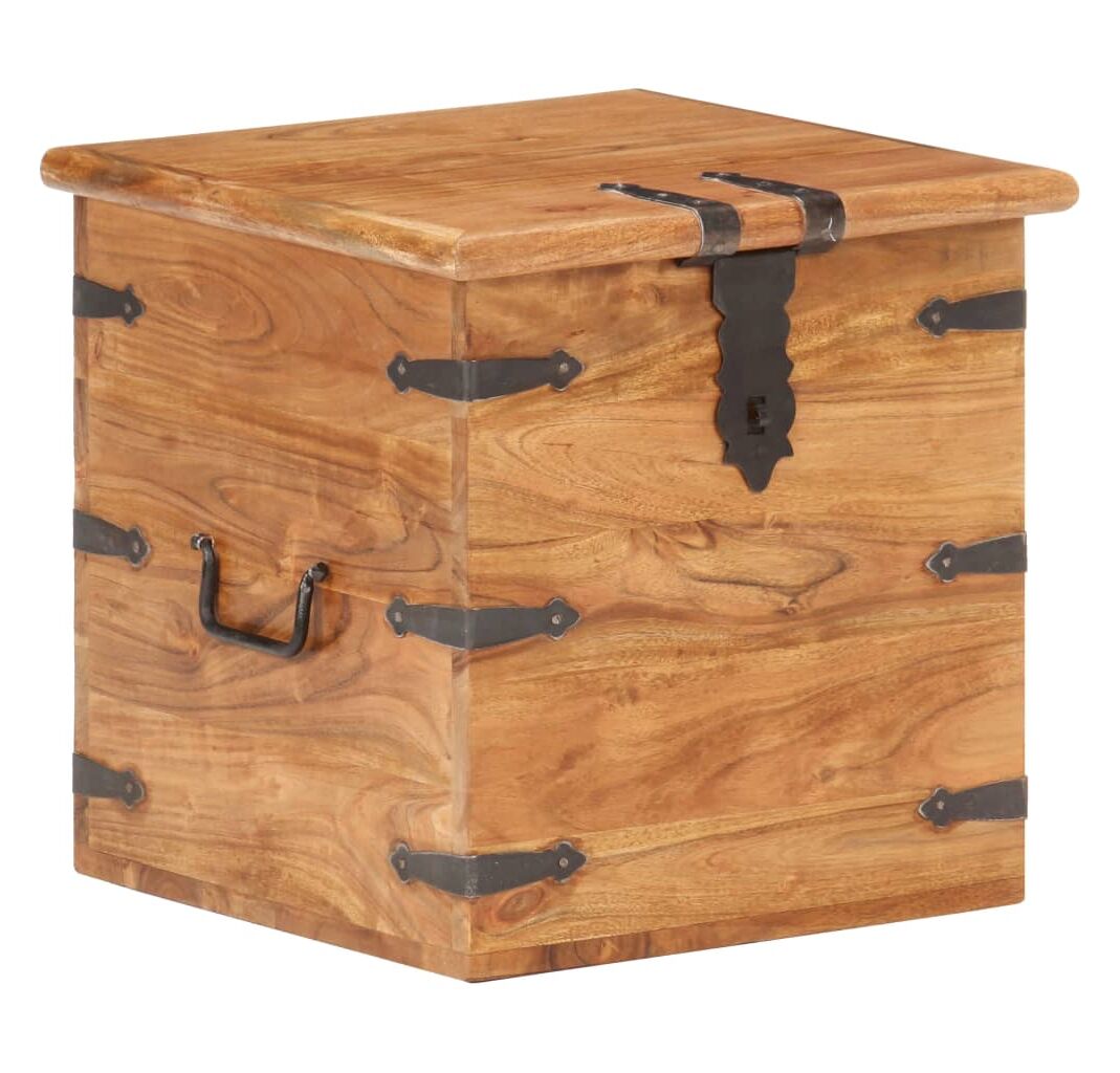 Cufărul este realizat din lemn masiv de acacia, făcându-l stabil și durabil. Are un zăvor în față și două mânere în lateral pentru a putea fi ridicat. Această ladă de depozitare, cu un blat neted, poate fi folosită și ca noptieră. Măiestria execuției și granulația frumoasă a lemnului fac fiecare piesă de mobilier unică și ușor diferită de celelalte.