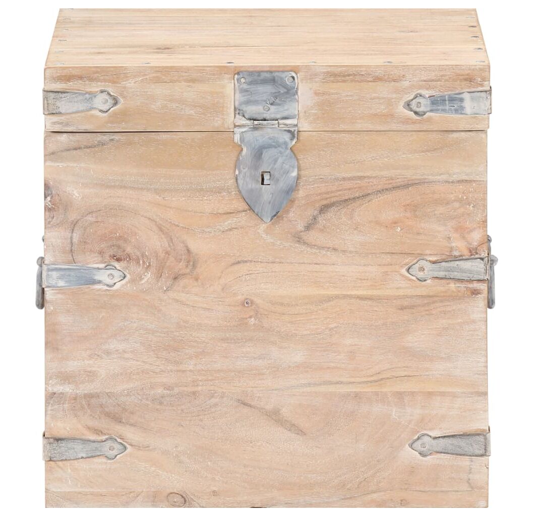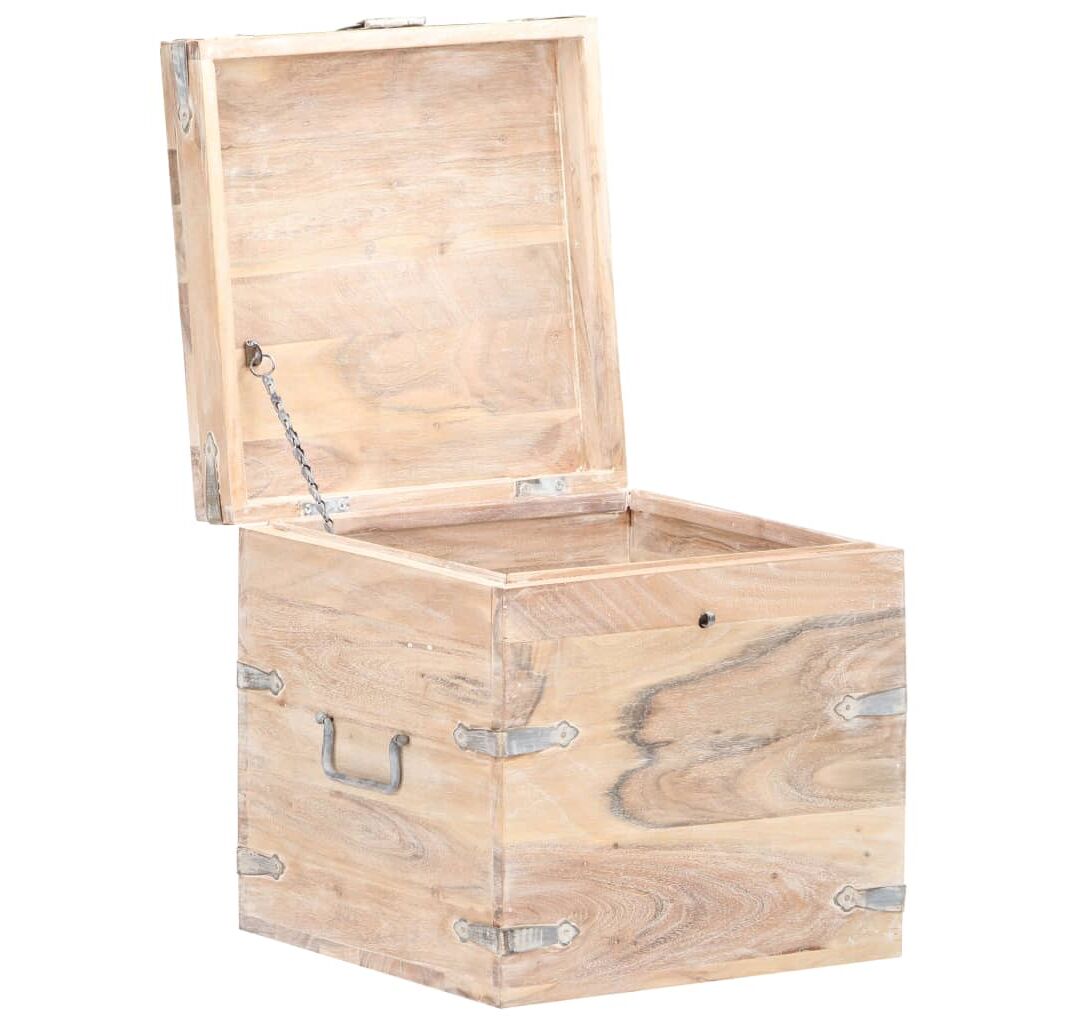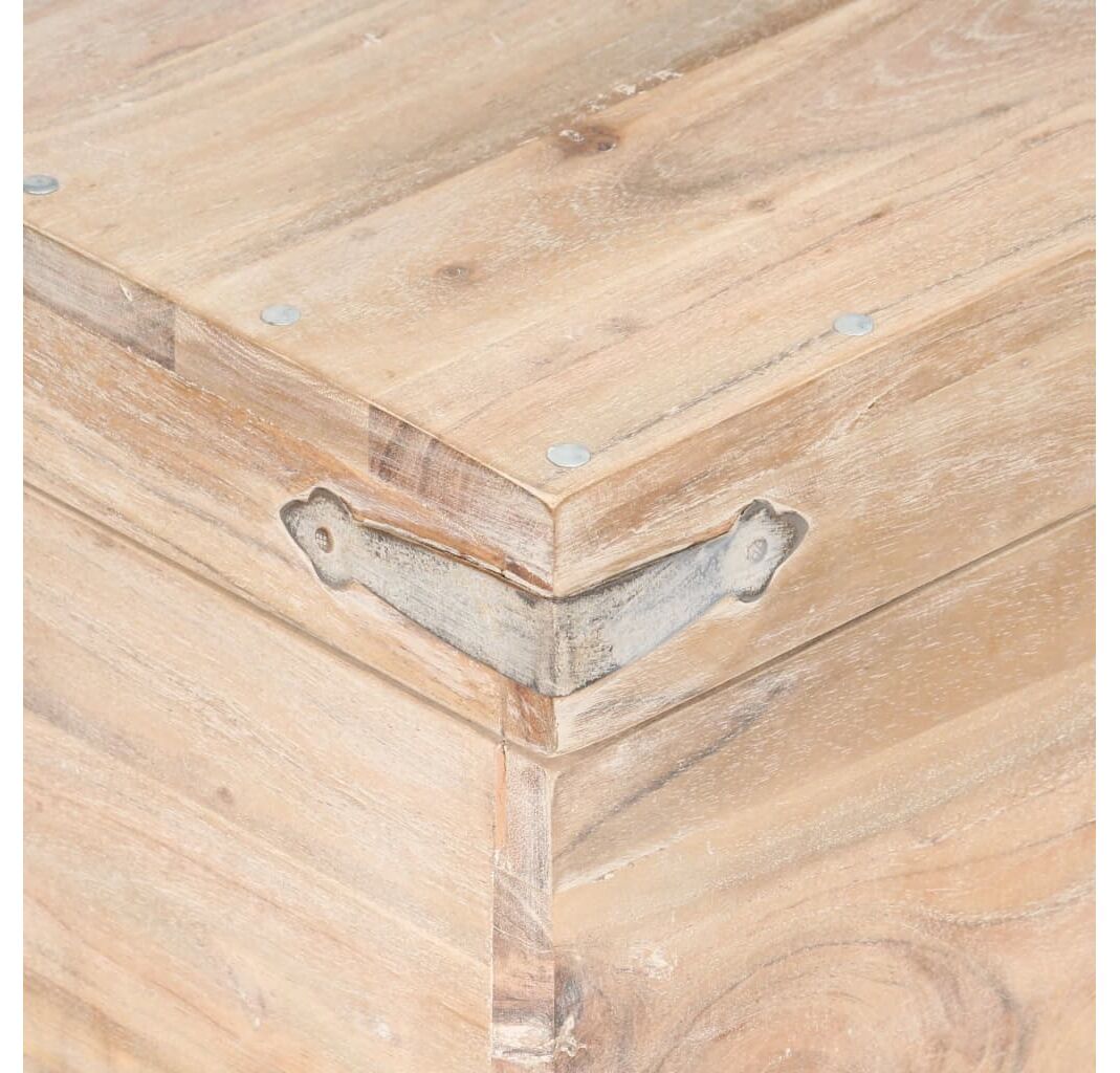Cufărul este realizat din lemn masiv de acacia, făcându-l stabil și durabil. Are un zăvor în față și două mânere în lateral pentru a putea fi ridicat. Această ladă de depozitare, cu un blat neted, poate fi folosită și ca noptieră. Măiestria execuției și granulația frumoasă a lemnului fac fiecare piesă de mobilier unică și ușor diferită de celelalte.