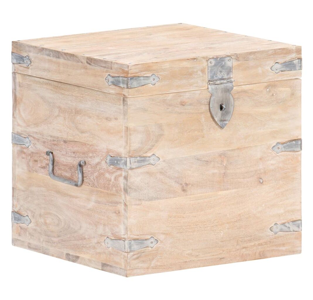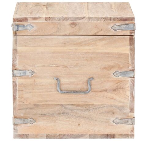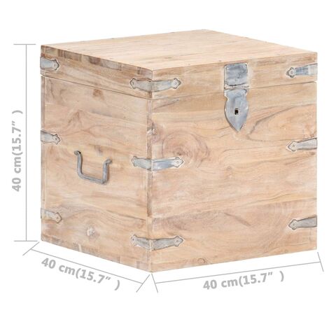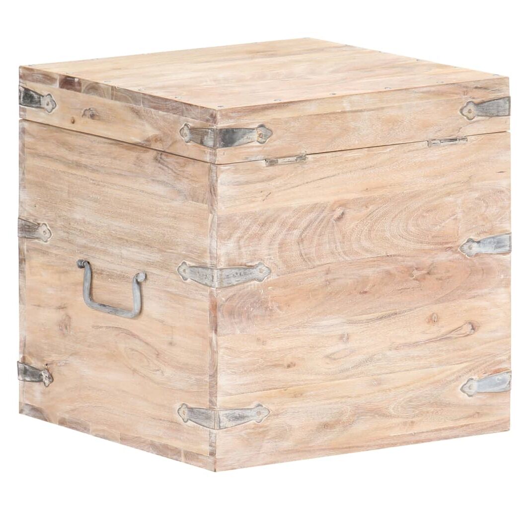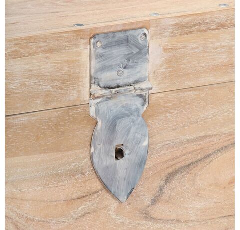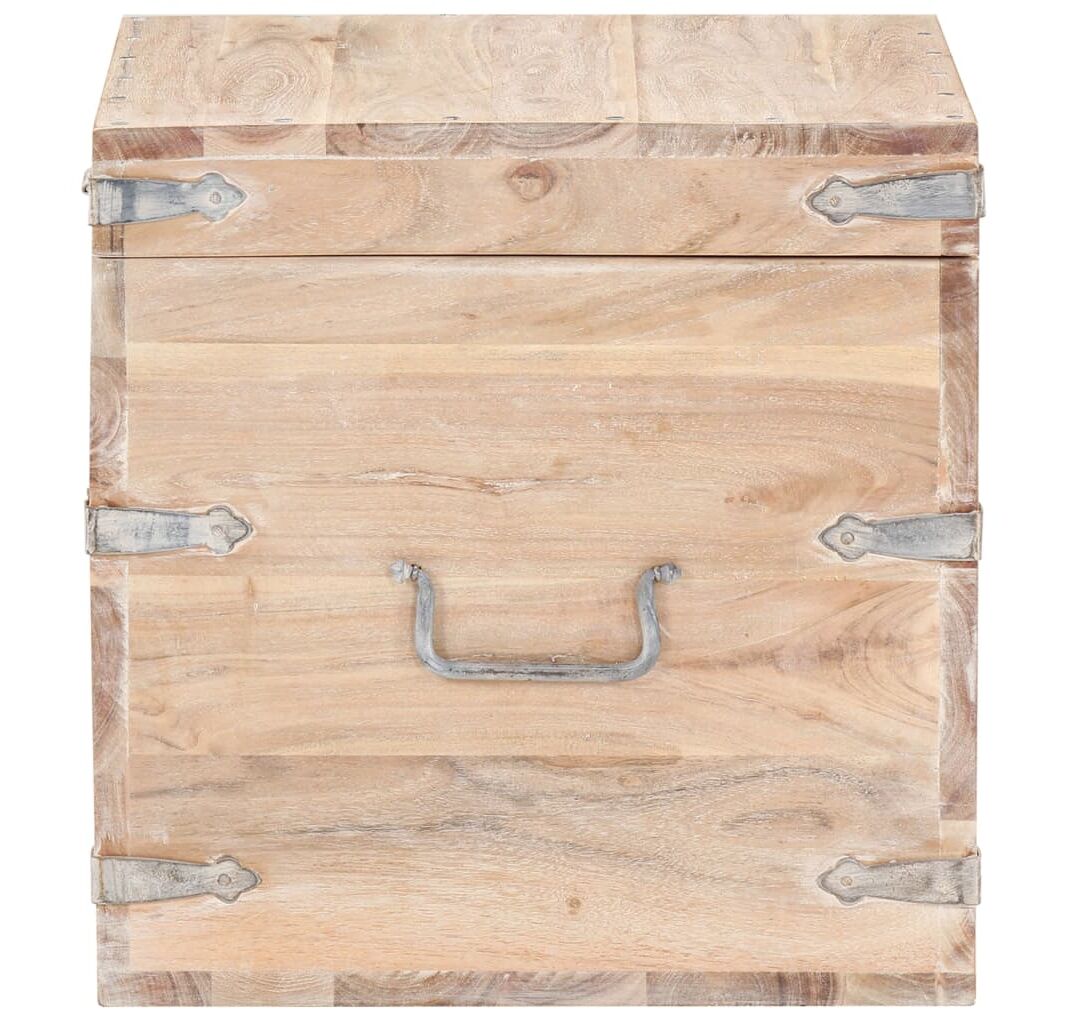 Cufărul este realizat din lemn masiv de acacia, făcându-l stabil și durabil. Are un zăvor în față și două mânere în lateral pentru a putea fi ridicat. Această ladă de depozitare, cu un blat neted, poate fi folosită și ca noptieră. Măiestria execuției și granulația frumoasă a lemnului fac fiecare piesă de mobilier unică și ușor diferită de celelalte.