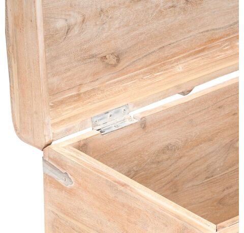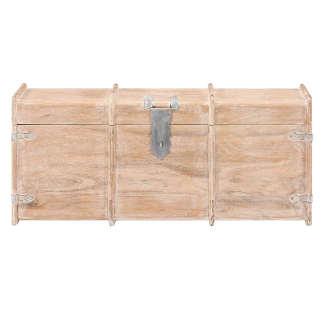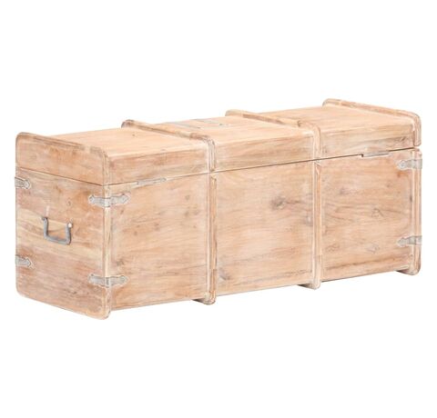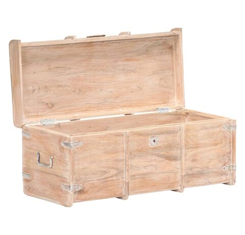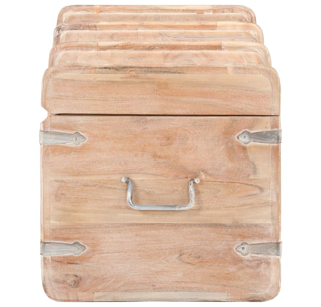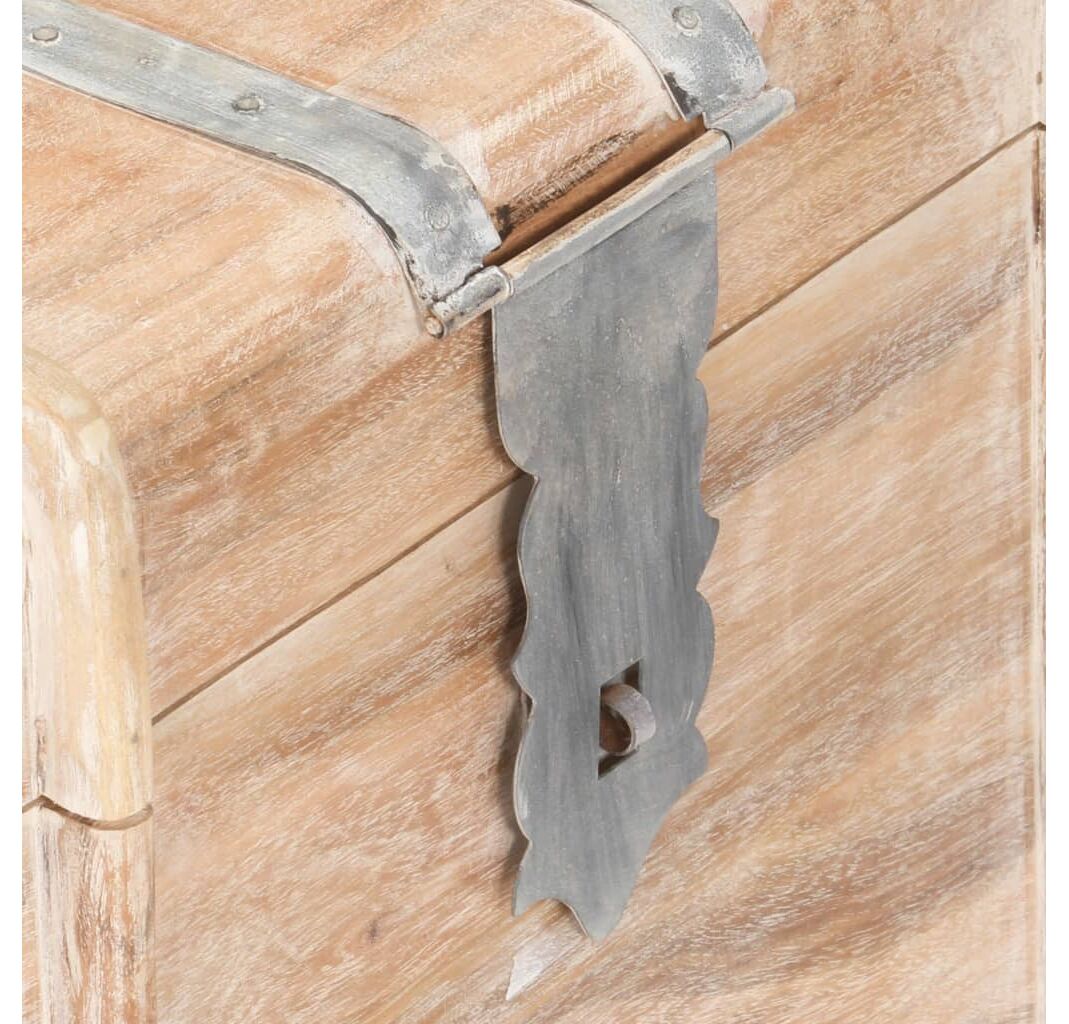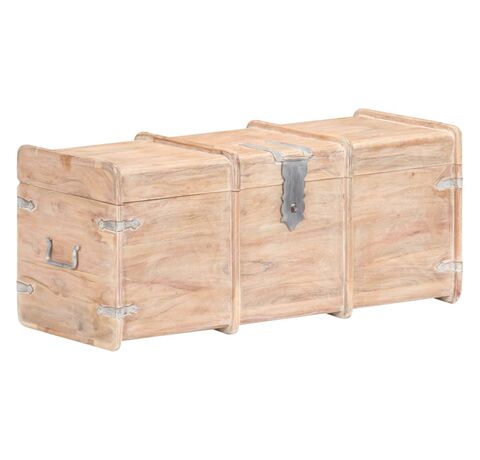 Acest cufăr de depozitare este realizat din lemn masiv de acacia, fiind stabil și durabil. Are un zăvor în față și două mânere pe lateral, pentru a putea fi ridicat. Această ladă de depozitare, cu un blat neted și stabil, poate fi folosită și pentru expunerea diverselor obiecte. Măiestria execuției și granulația frumoasă a lemnului fac ca fiecare piesă de mobilier să fie unică și ușor diferită de celelalte.