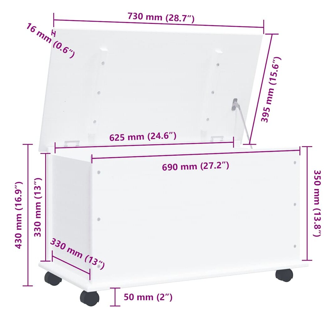 - Ușor de deschis și mutat: puteți deschide și închide ușor capacul datorită balamalelor. În plus, cufărul de depozitare poate fi deplasat fără efort datorită roților care rulează ușor.