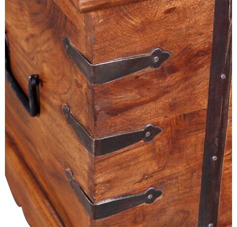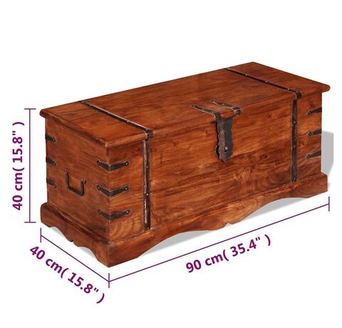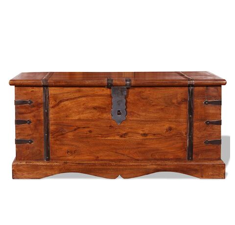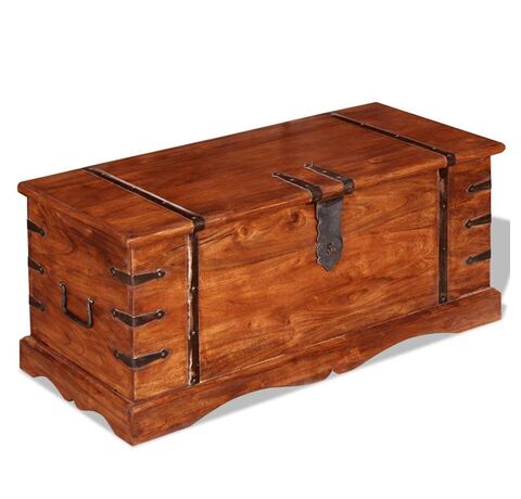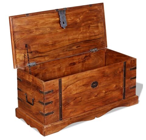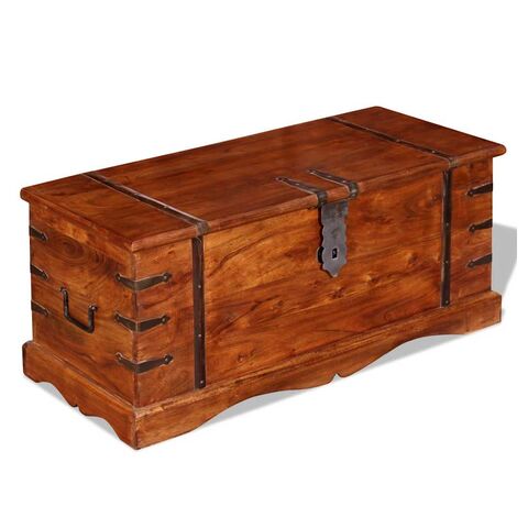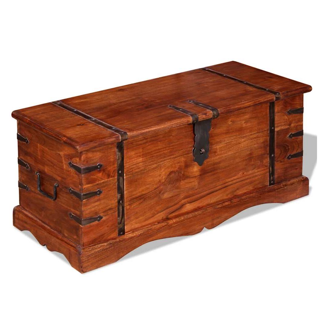 Cutia de depozitare oferă spațiu amplu de depozitare pentru haine, reviste, cărți, unelte și alte accesorii. Dispun de un zăvor în față și două mânere pe lateral. Cu un blat plat stabil, această cutie din lemn poate fi folosită și ca măsuță de cafea, masă de canapea, masă de sufragerie, măsuță laterală, masă de capăt, etc. Lada de depozitare este realizată manual din lemn masiv de acacia, având caracteristicile palisandrului și lemnului de trandafir. Măiestria rafinată și fibrele frumoase ale lemnului fac fiecare piesă de mobilier unică și ușor diferită de cealaltă.