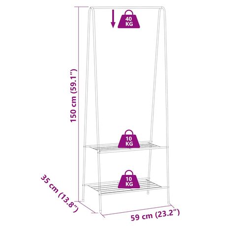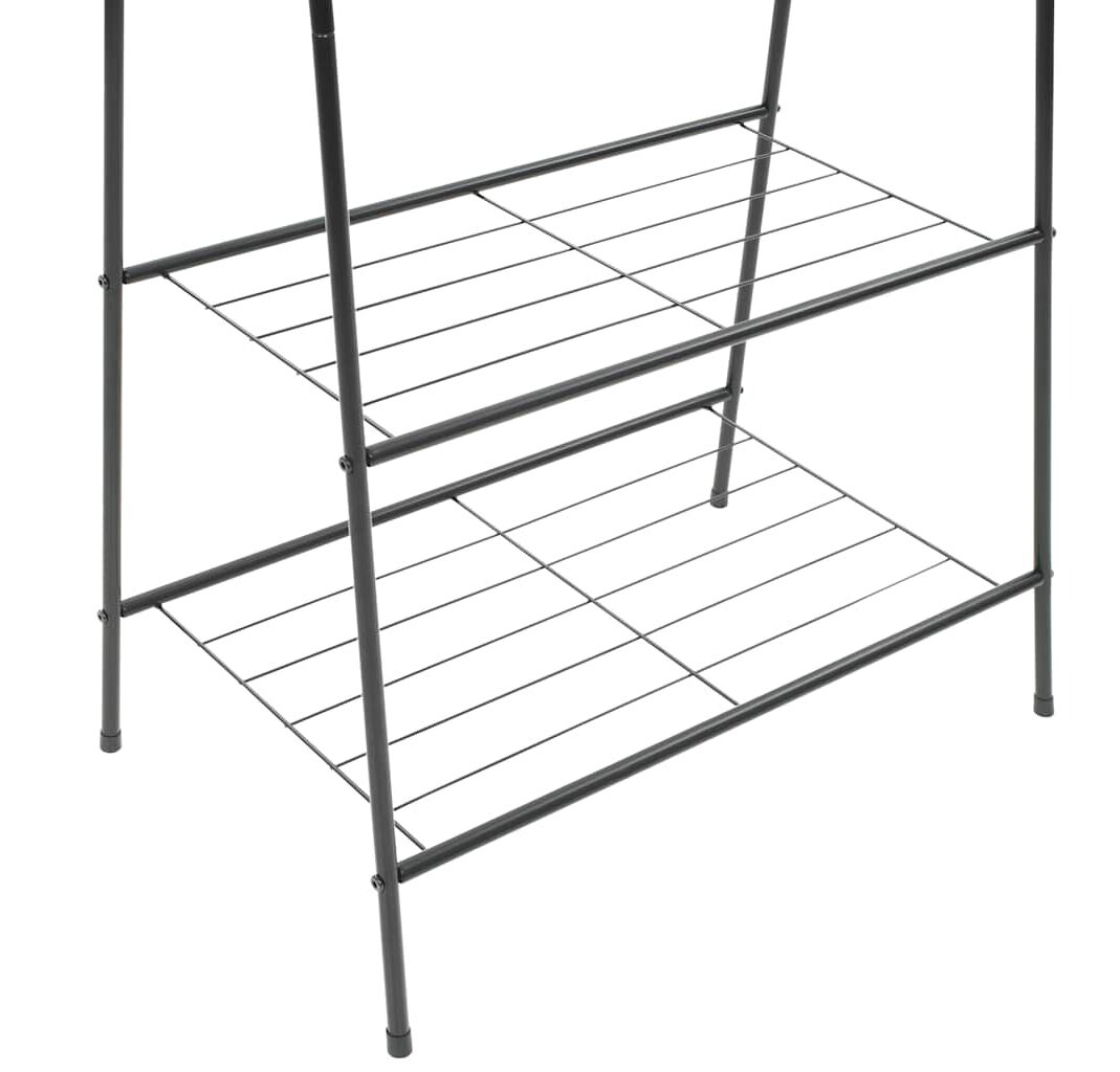 Cuierul de haine este realizat dintr-un cadru robust de oțel, fiind stabil și durabil. Organizatorul de haine are 2 rafturi care oferă spațiu amplu pentru păstrarea genților sau pantofilor. Designul simplu și stilat adaugă un farmec elegant în decorul casei dvs.