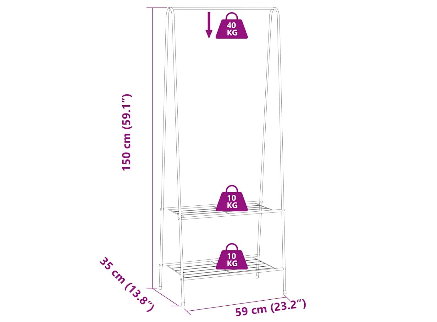 Cuierul de haine este realizat dintr-un cadru robust de oțel, fiind stabil și durabil. Organizatorul de haine are 2 rafturi care oferă spațiu amplu pentru păstrarea genților sau pantofilor. Designul simplu și stilat adaugă un farmec elegant în decorul casei dvs.
