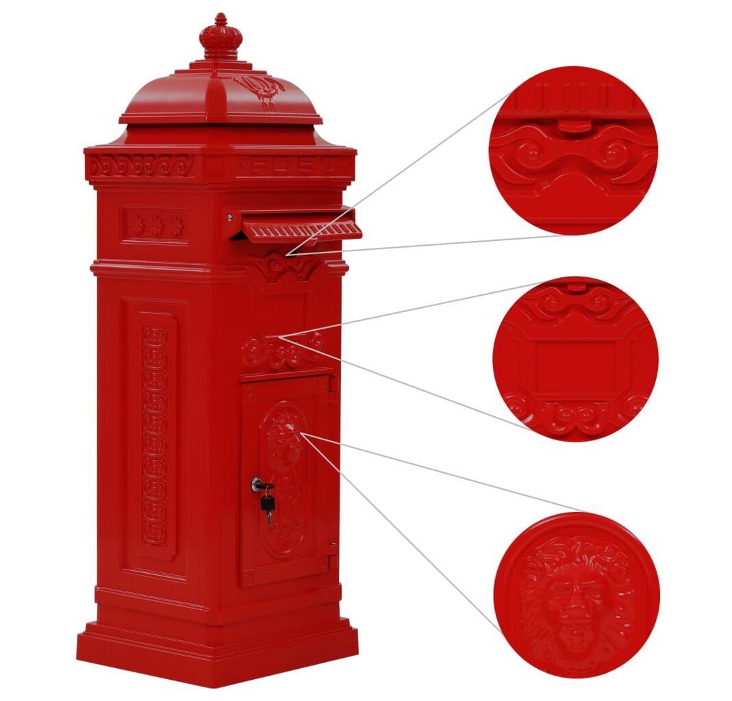 Această cutie de scrisori este prevăzută cu o fantă mare, pentru introducerea scrisorilor, și o clapă, care are rolul de a proteja interiorul de condițiile meteo nefavorabile. De asemenea, cutia include 2 uși ce se pot încuia (sunt incluse și 2 chei pentru fiecare ușă), pentru a scoate cu ușurință scrisorile. Cutia poștală este fabricată din aluminiu turnat, rezistent la intemperii și inoxidabil, fiind ideală pentru folosirea în aer liber. În plus, cutia poștală este remarcabilă datorită abundenței de detalii decorative rafinate, în stil vintage, devenind punctul de atracție de pe aleea din grădină sau de la intrarea în casă.