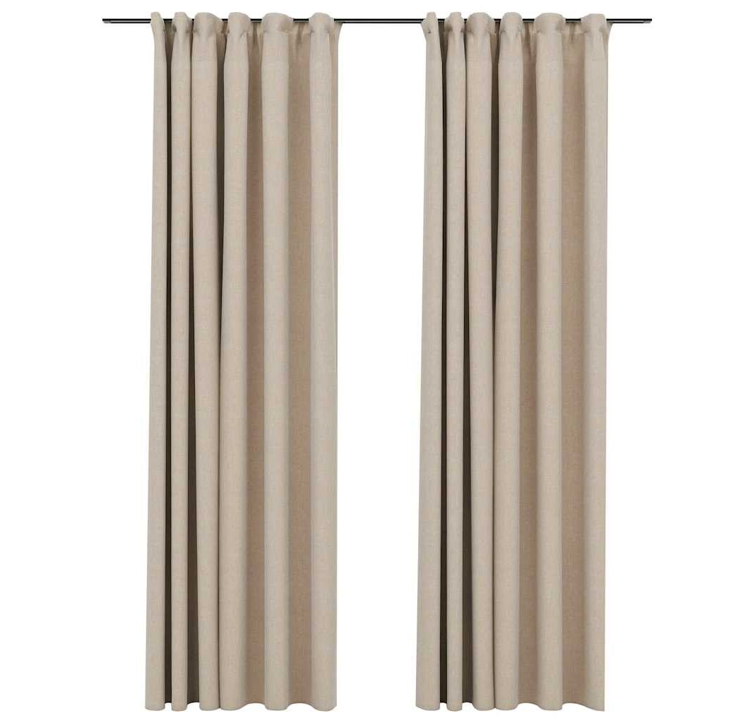 Perdelele pot fi agățate cu ușurință pe șinele de perdea, datorită cârligelor metalice. Draperiile, realizate din țesătură premium 100% poliester, cu aspect de pânză, se pot spăla la mașină. Vă rugăm să rețineți: tija de perdea nu este inclusă.