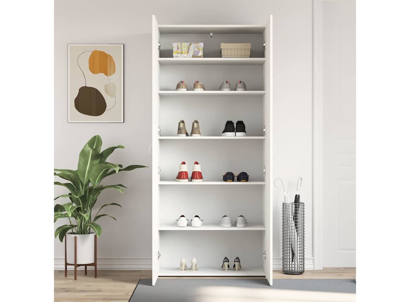 • Depozitare Generoasă: Acest dulap stochează multe pantofi, menținându-i organizat și accesibil.