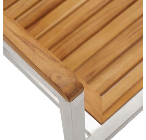 Construită din lemn de tec de esență tare, extrem de rezistent, această piesă de mobilier a fost uscată în cuptor și apoi șlefuită fin, pentru un aspect foarte neted. Lemnul de tec este cunoscut pentru robustețea sa excepțională și rezistența la intemperii, fiind mai potrivit pentru mobilierul de grădină decât orice alt tip de lemn. Lemnul de tec este alegerea perfectă dacă doriți să achiziționați o piesă de mobilier de grădină care va rezista o perioadă lungă de timp. Scaunele sunt, de asemenea, fabricate din oțel inoxidabil 304 de înaltă calitate, ceea ce le face rezistente la rugină și ușor de curățat. În plus, perna oferă un plus de confort în timpul relaxării. Fiecare pernă are două seturi de sfori, pentru o fixare mai bună pe scaunul de exterior.