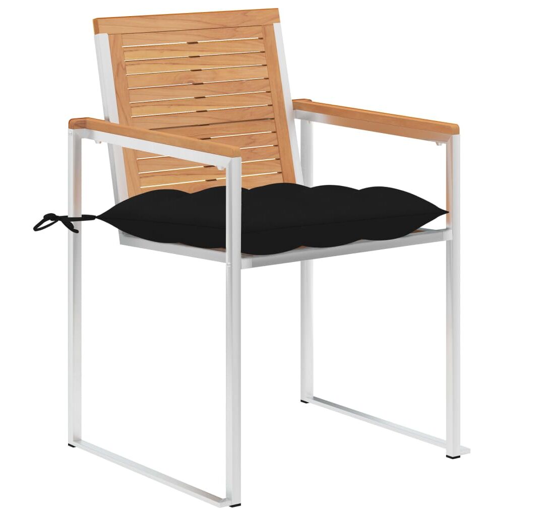 Construită din lemn de tec de esență tare, extrem de rezistent, această piesă de mobilier a fost uscată în cuptor și apoi șlefuită fin, pentru un aspect foarte neted. Lemnul de tec este cunoscut pentru robustețea sa excepțională și rezistența la intemperii, fiind mai potrivit pentru mobilierul de grădină decât orice alt tip de lemn. Lemnul de tec este alegerea perfectă dacă doriți să achiziționați o piesă de mobilier de grădină care va rezista o perioadă lungă de timp. Scaunele sunt, de asemenea, fabricate din oțel inoxidabil 304 de înaltă calitate, ceea ce le face rezistente la rugină și ușor de curățat. În plus, perna oferă un plus de confort în timpul relaxării. Fiecare pernă are două seturi de sfori, pentru o fixare mai bună pe scaunul de exterior.