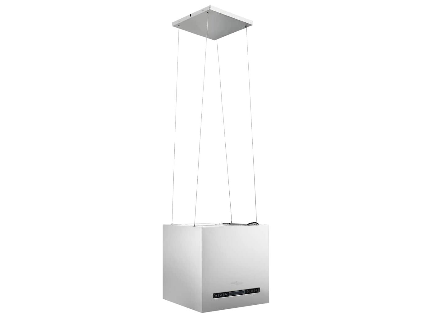 Această hotă insulă de bucătărie se va monta pe tavan cu o placă din oțel inoxidabil. Frânghiile din oțel suspendate pot fi reglate pentru a ridica sau a coborî hota.