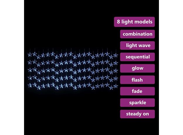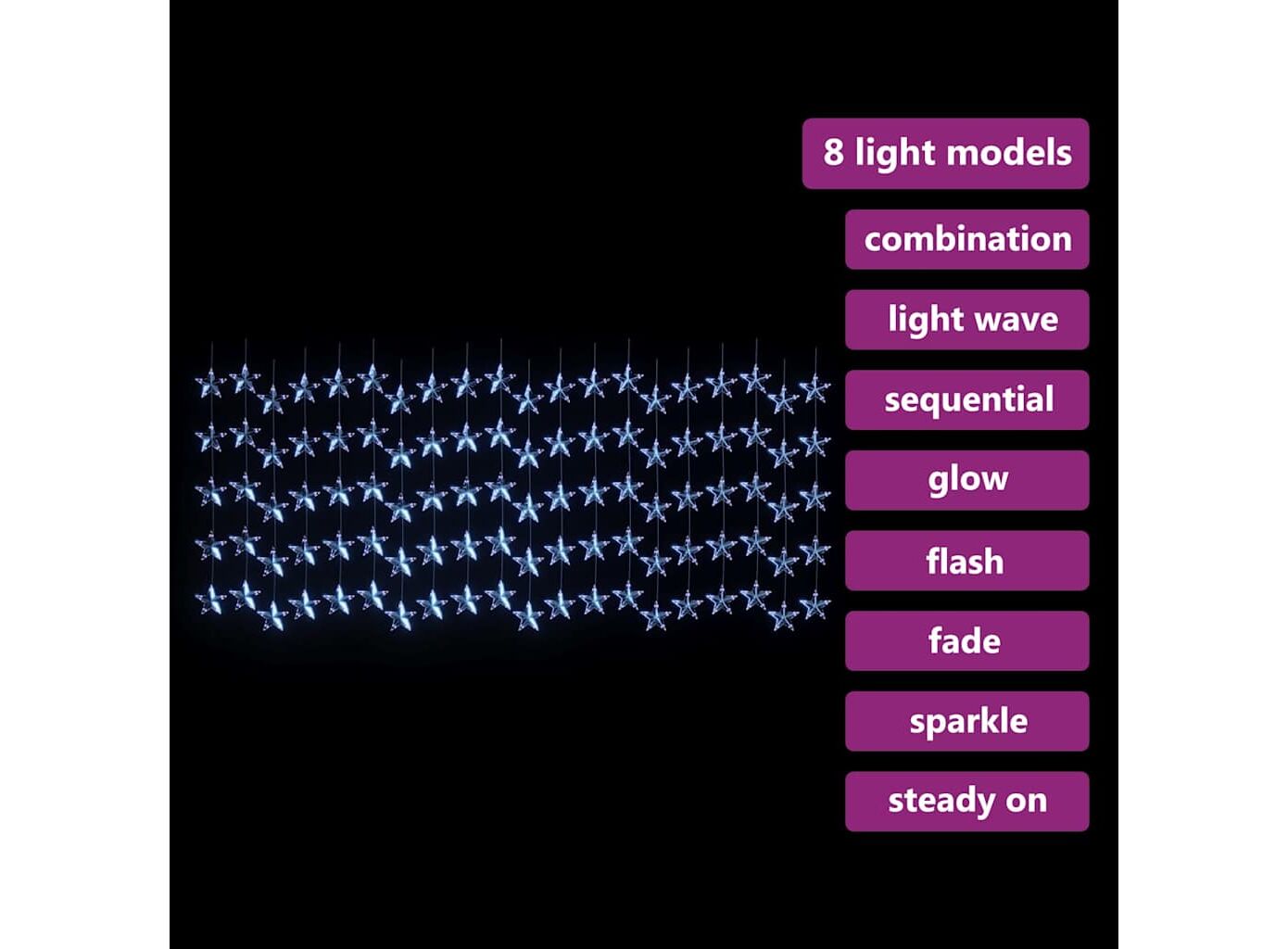 Această instalație de lumini feerice stele cu LED, tip perdea, este perfectă pentru a fi utilizată ca o completare de iluminat pentru orice proiect decorativ. Este potrivită pentru Crăciun, petreceri, nunți și alte sărbători.