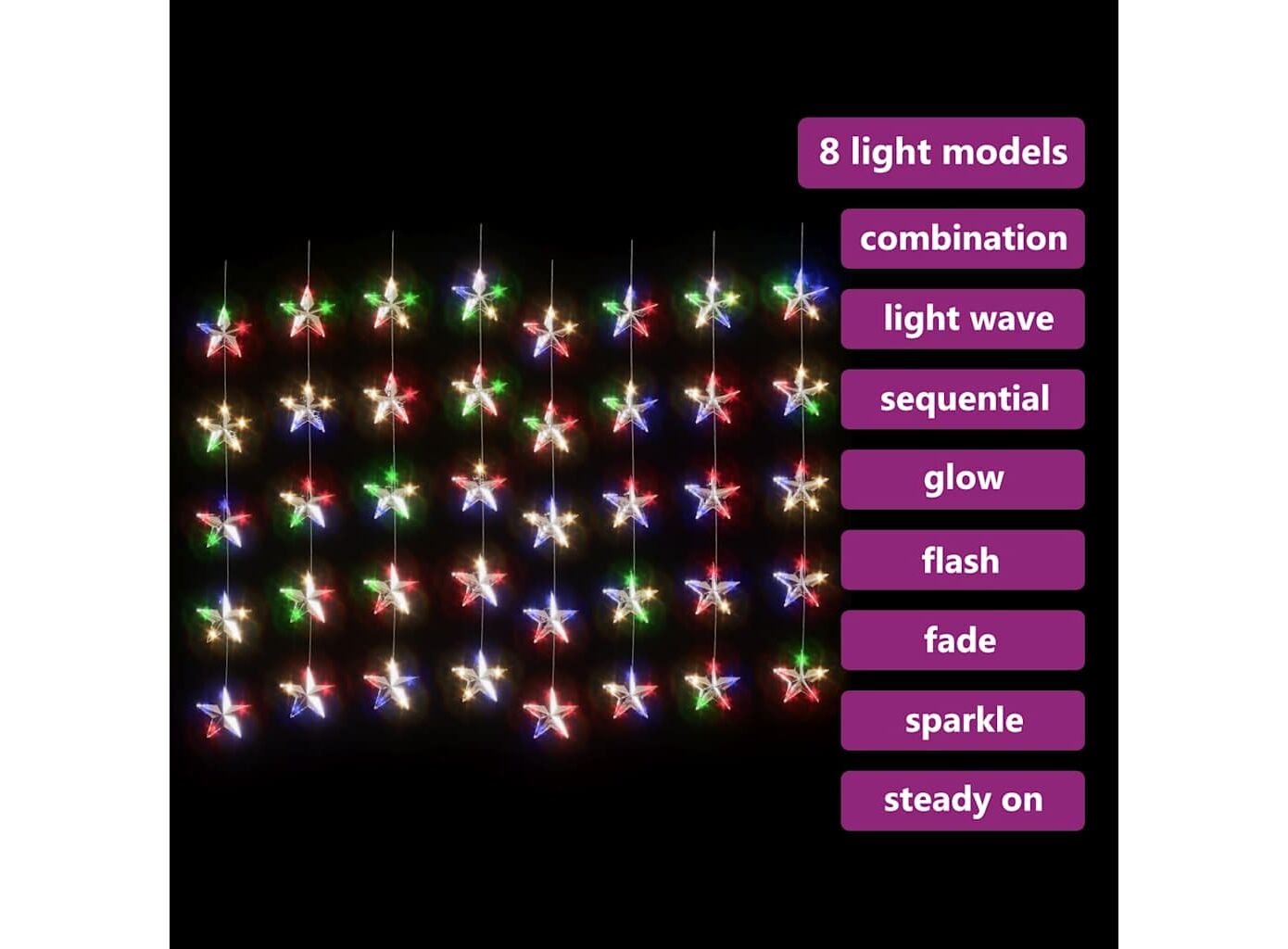 Această instalație de lumini feerice stele cu LED, tip perdea, este perfectă pentru a fi utilizată ca o completare de iluminat pentru orice proiect decorativ. Este potrivită pentru Crăciun, petreceri, nunți și alte sărbători.