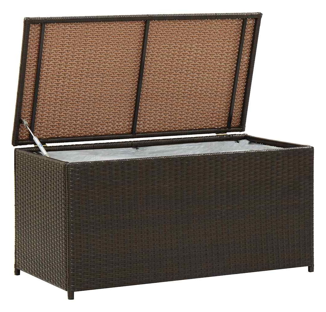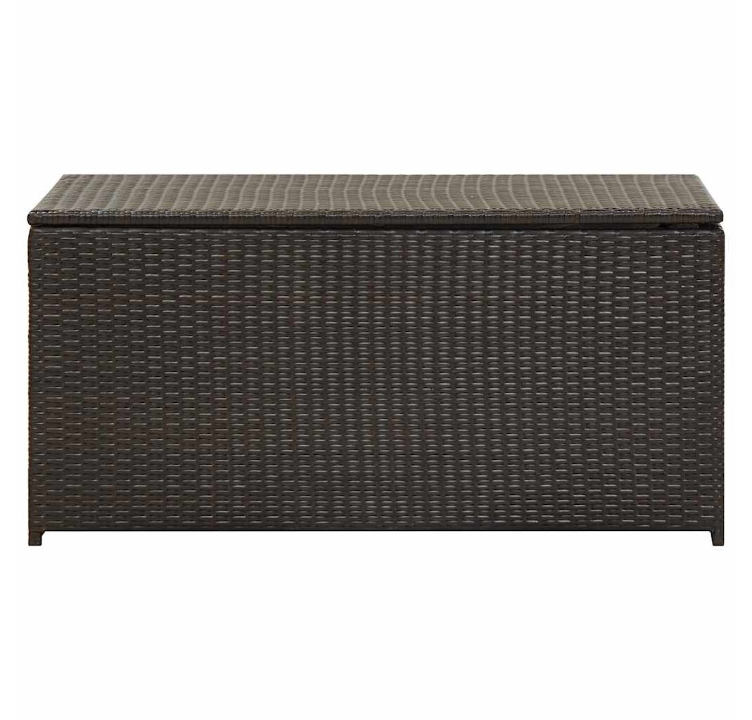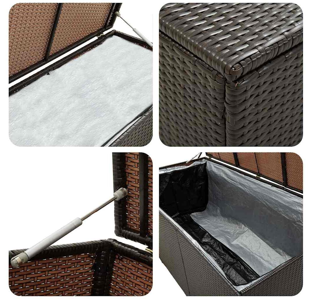 Proiectat cu un spațiu de depozitare generos, acest cufăr este suficient de mare pentru a depozita obiecte de grădină precum: perne de mobilier, perne decorative, pături suplimentare, jucării pentru piscină și unelte de grădinărit. Această ladă de depozitare este construită dintr-un cadru de oțel vopsit electrostatic și din poliratan împletit manual, fiind durabilă și rezistentă la rugină și intemperii, pentru o utilizare fiabilă de lungă durată. Căptușeala cu închidere cu fermoar va proteja conținutul de praf și umiditate. Datorită picioarelor înălțate, această cutie de depozitare asigură o bună circulație a aerului dedesubt și menține obiectele uscate și curate. Este ușor de șters cu o cârpă umedă.
