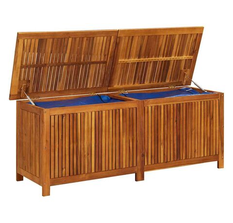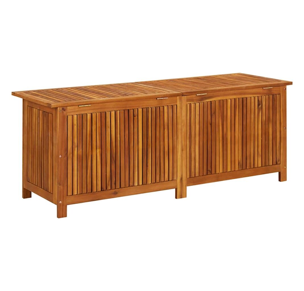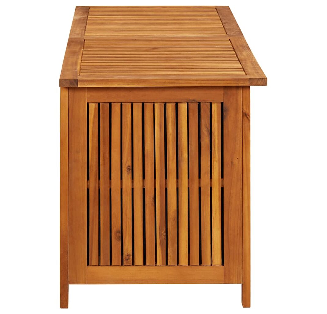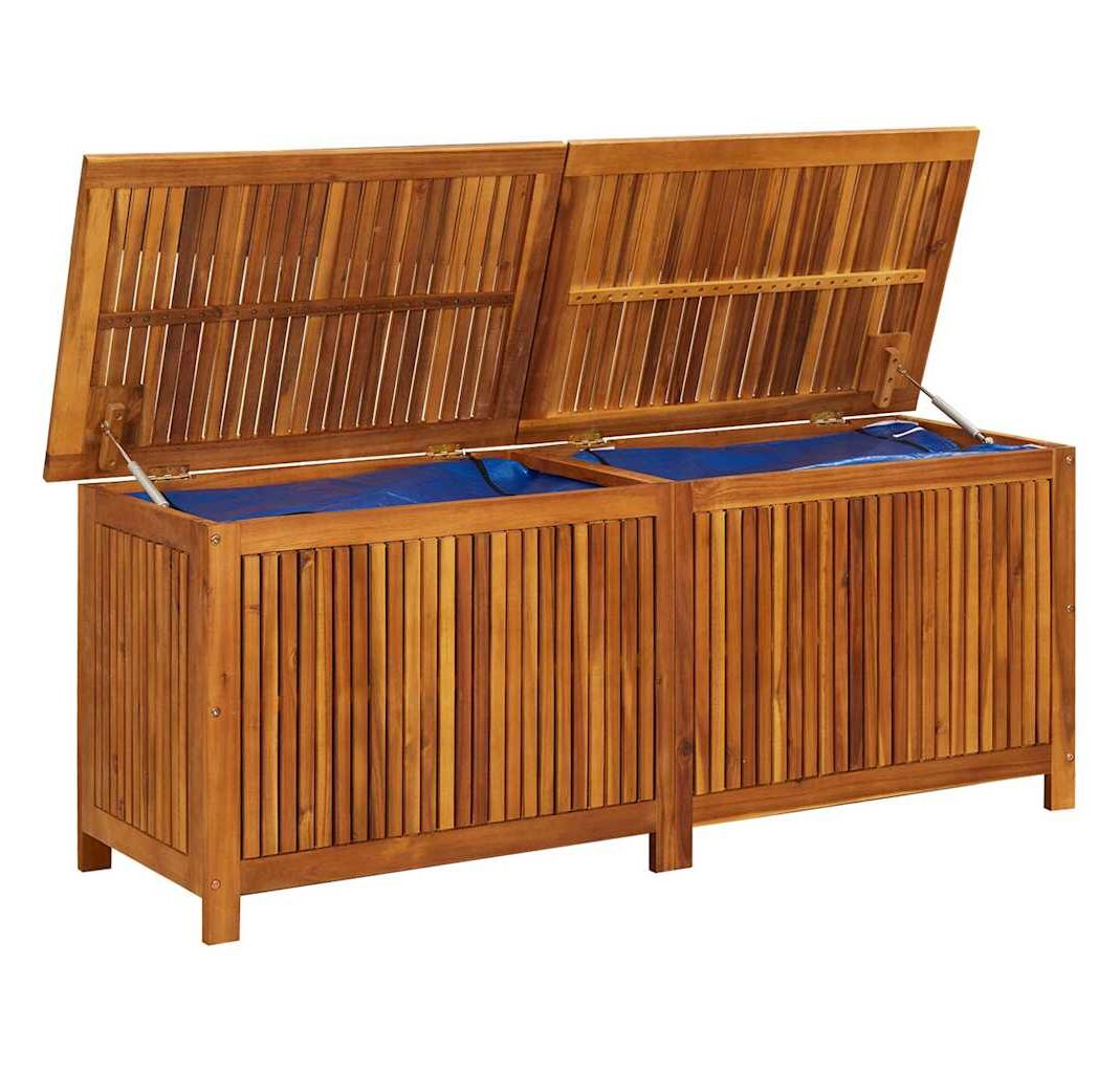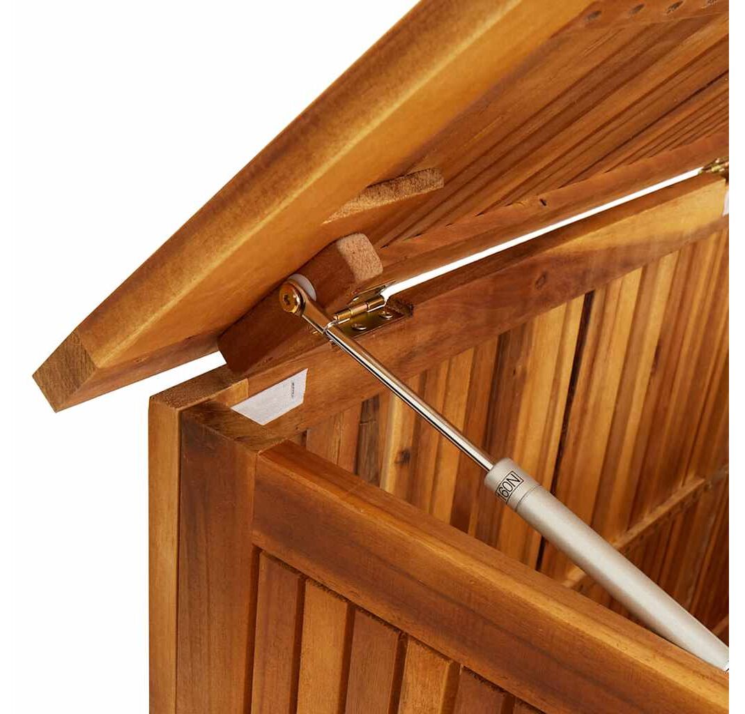 Cutia de perne este realizată din lemn masiv de acacia cu finisaj de ulei și include un sac rezistent la apă în interior cu fermoar, ceea ce o face rezistentă la uzură, foarte durabilă și potrivită pentru utilizare în spațiul exterior. De asemenea, reprezintă o soluție ideală de depozitare pentru perne, pernuțe decorative, pături suplimentare sau alte articole de uz casnic ori de grădină, pentru a le păstra la îndemână și bine organizate.