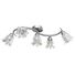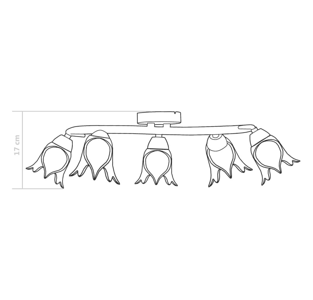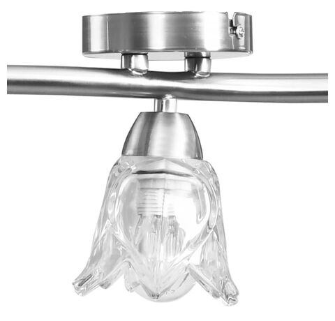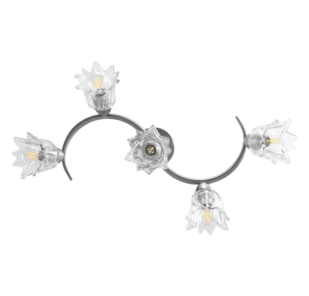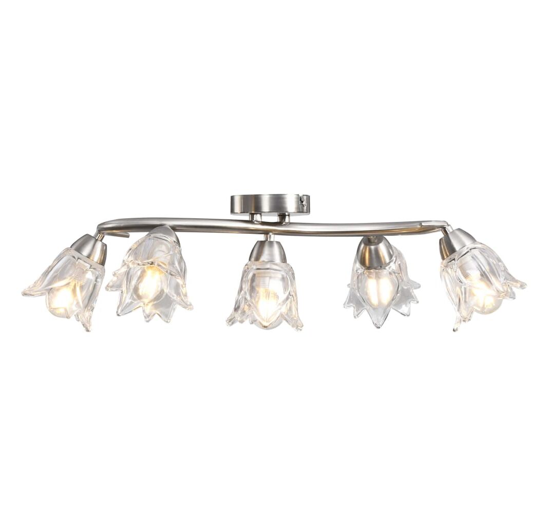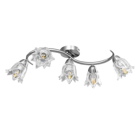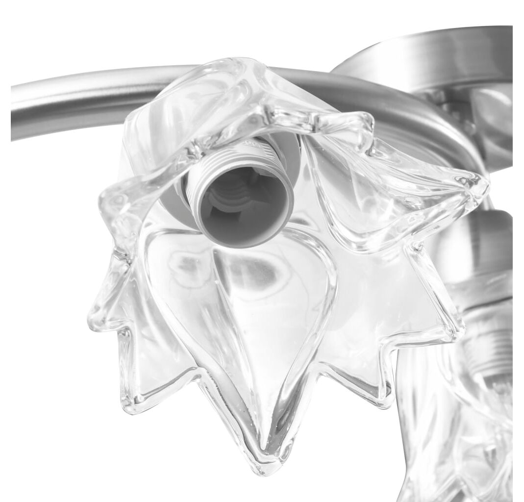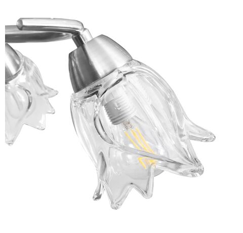 Lampa poate fi montată cu ușurință pe orice tavan, cu o bază metalică durabilă. Cinci tuburi din oțel cromat cu model încâlcit și abajururile din sticlă transparentă în formă de lalea completează aspectul elegant. Finisajul cromat satinat oferă un stil contemporan acestei lămpi, fiind perfectă pentru orice stil de sufragerie sau dormitor. De asemenea, este ușor de întreținut și de curățat cu o cârpă umedă.